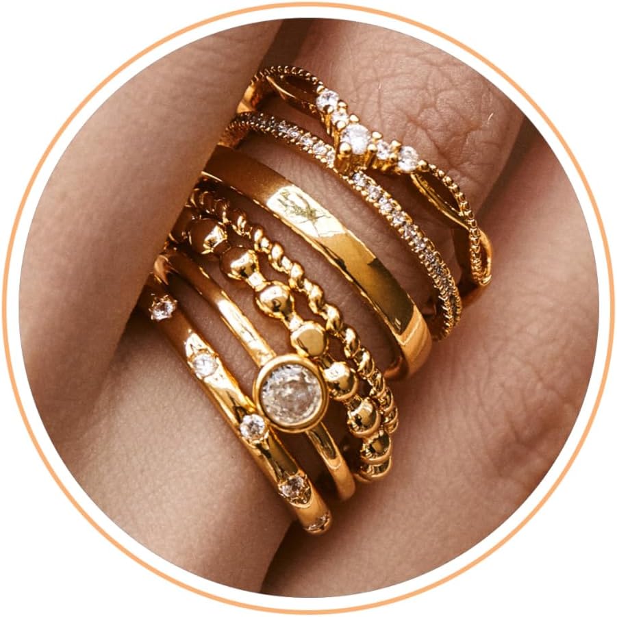 مجموعة خواتم ذهبية قابلة للتكديس - يمكنك الحصول على 6 خواتم ذهبية بتصميمات فريدة تتراوح من عناصر الماس البسيطة إلى المعقدة. يمكن ارتداء حلقات التراص هذه بشكل منفصل أو مكدسة، ومناسبة للارتداء اليومي. يمكن مطابقة حلقات التراص المكعبة هذه من الزركونيا مع العديد من الأشكال المختلفة. الملابس والمناسبات، تظهر أفضل مظهر لديك.