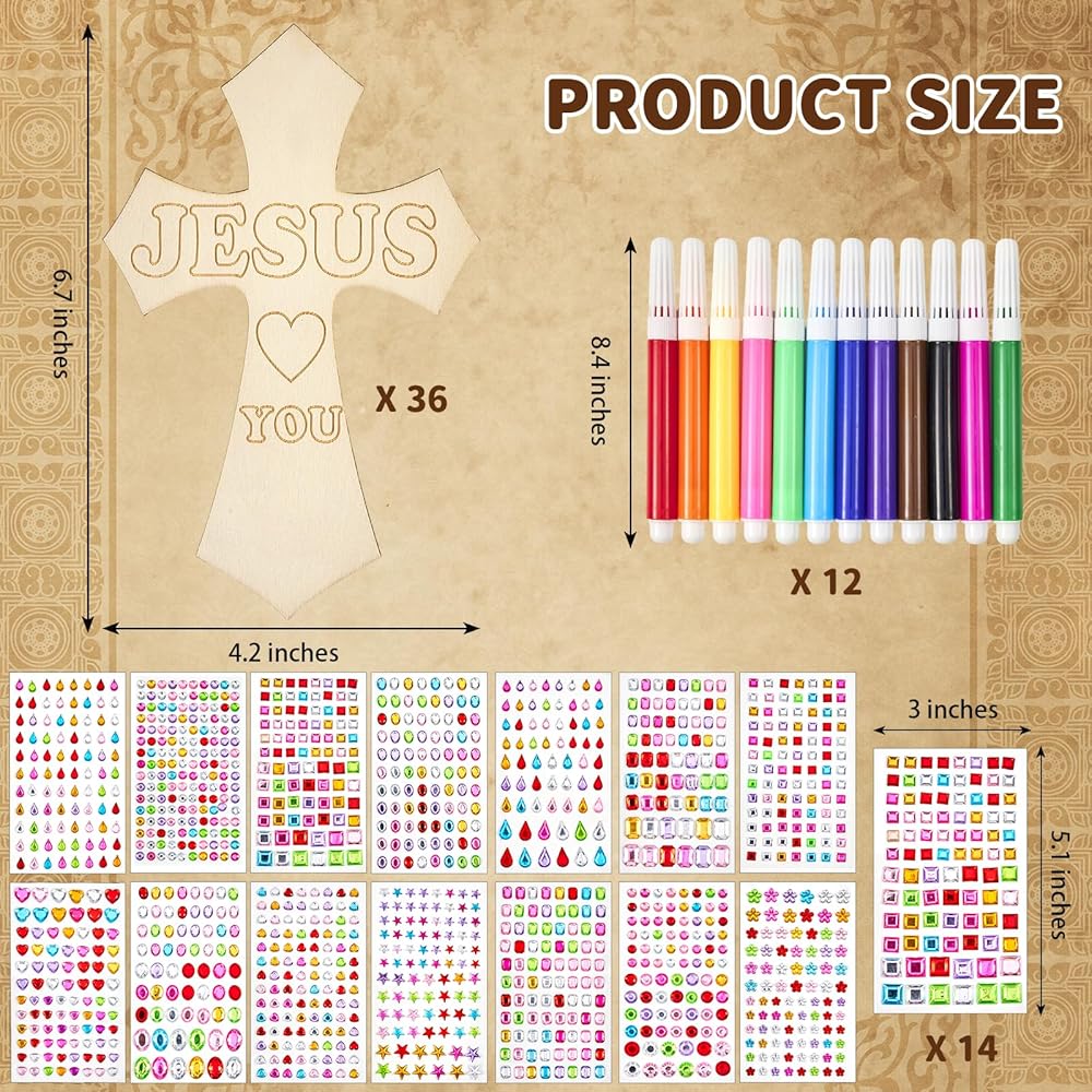 36 Pieces Wood Cross Crafts for Kids DIY Wooden Cross for Christian Jesus Sunday School Vacation Bible School Crafts Supplies with 14 Pieces Stickers and 12 Pieces Watercolor Pens