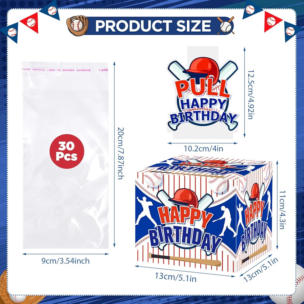 Baseball Birthday Money Box: This baseball birthday pull money gift box set includes 1 piece baseball birthday gift money box + 1 piece baseball happy birthday pull out card + 30 pieces transparent bags, and the baseball birthday pull money box features exquisite baseball birthday celebration pattern, which will brings a perfect birthday party.