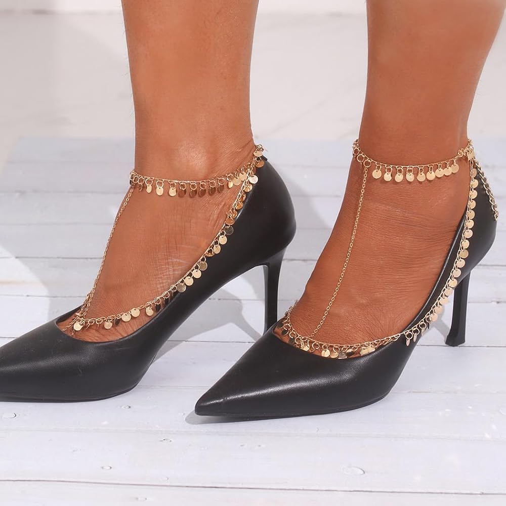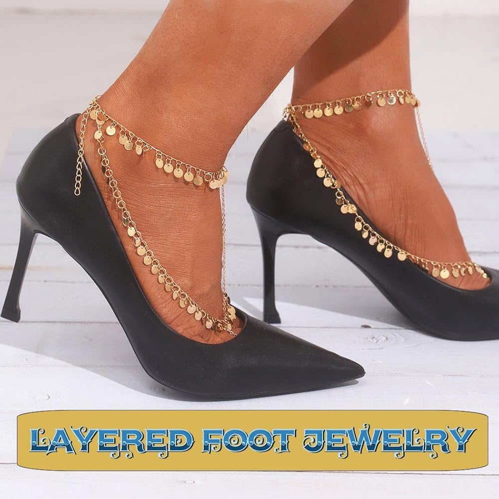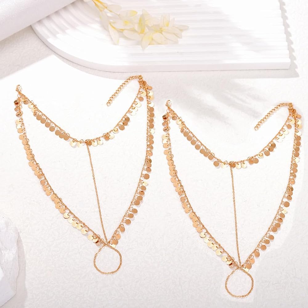 2 قطعة سلسلة قدم من الترتر الذهبي بوهو خلخال مطرز بطبقات من الشرابة صنادل حفاة القدم للنساء