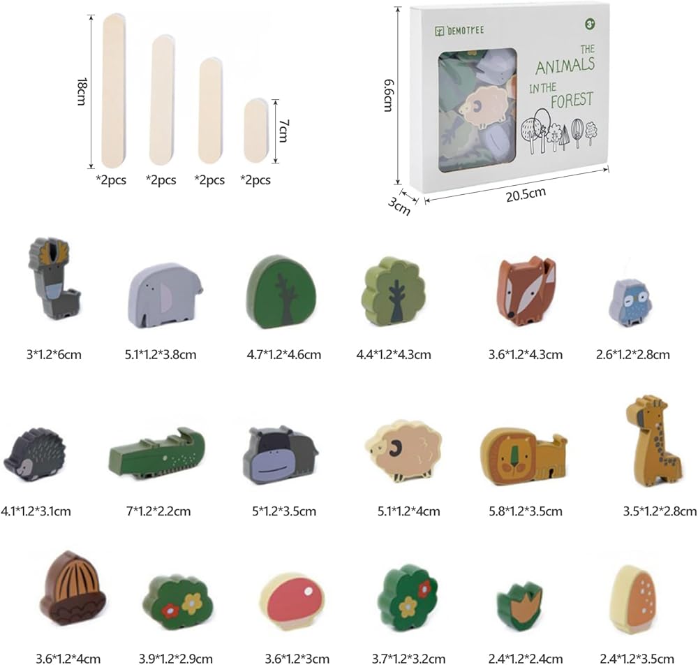 【مكعبات تكديس الحيوانات الخشبية】: استمتع بتجربة متعة مكعبات التراص الخشبية الاستثنائية لدينا، والتي تتميز بـ 18 مكعب بناء حيواني ملون بشكل ساحر مثل النمر والأسد والزرافة والمزيد. مكملة بـ 4 قواعد متأرجحة لعارضة التوازن، توفر هذه المكعبات اللعب والتعلم. بفضل تصميماتها الرائعة والنابضة بالحياة، فهي بمثابة ألعاب وديكورات للغرفة، مما يضيف سحرًا إلى أي مساحة.