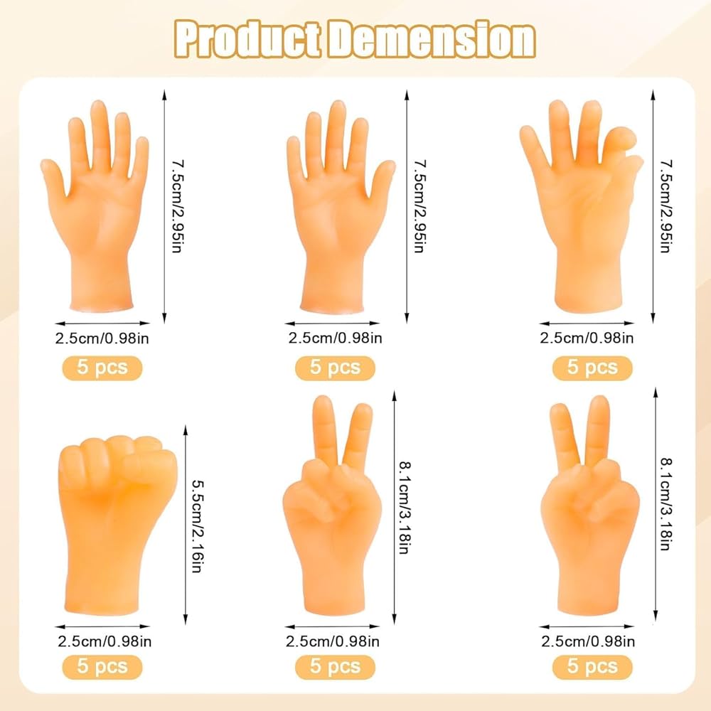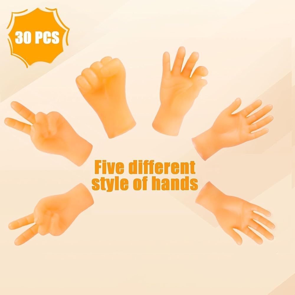 Value Pack: You will get 30pcs little hands, 5 left hands, 5 right hands, 5 fist, 5 finger hand for victory, 5 OK finger hand and 5 middle finger gesture hand. You can play with your friends, family or pets with these fun little hands