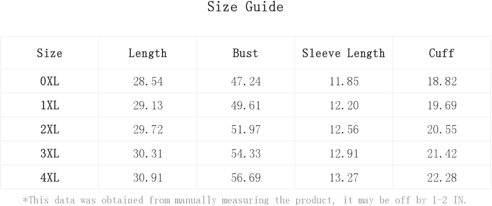 1XL:Bust:49.6IN,Cuff:19.7IN,Length:29.1IN,Sleeve Length:12.2IN