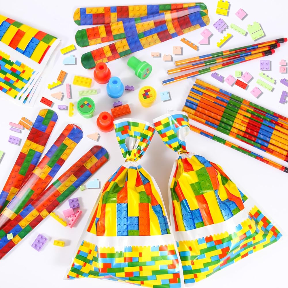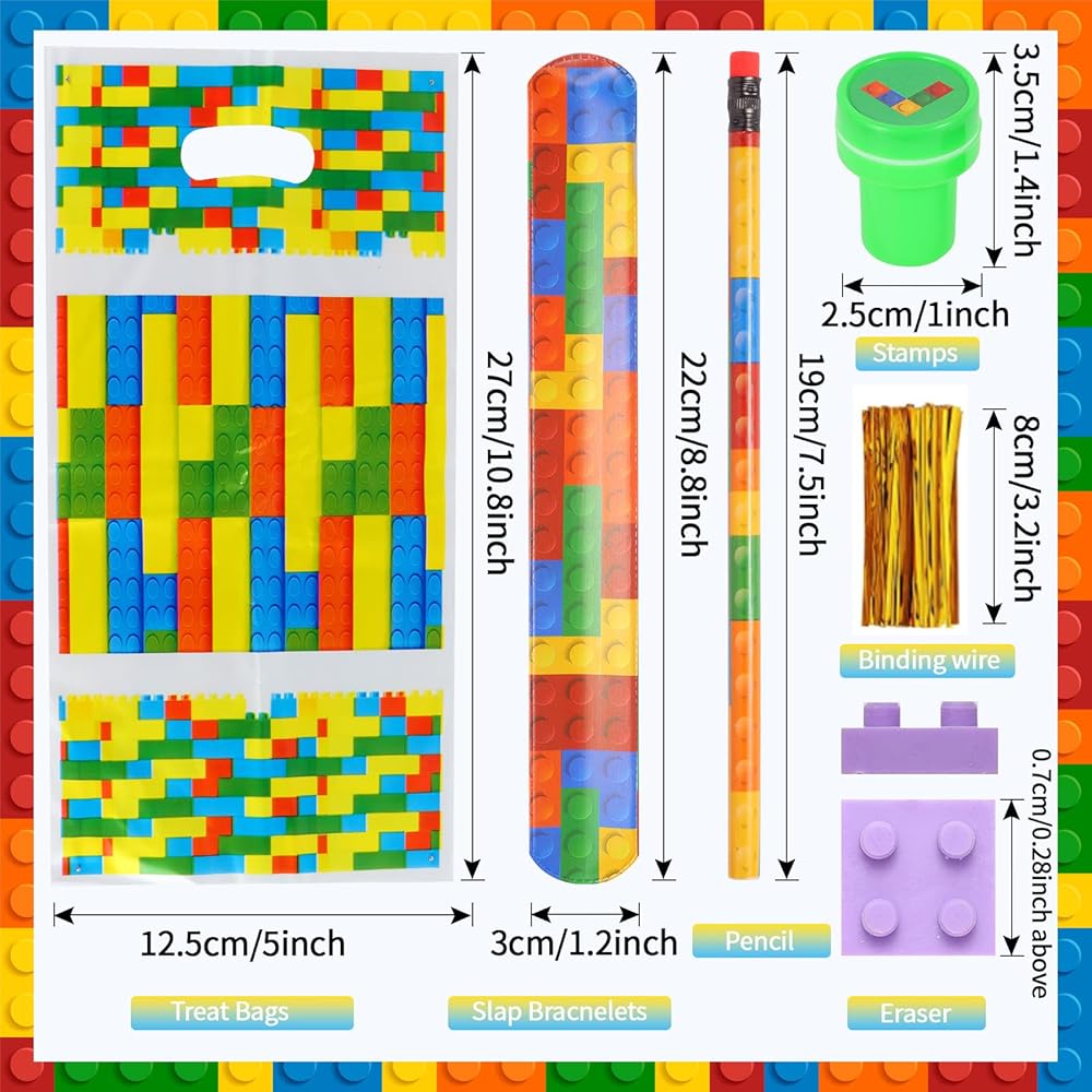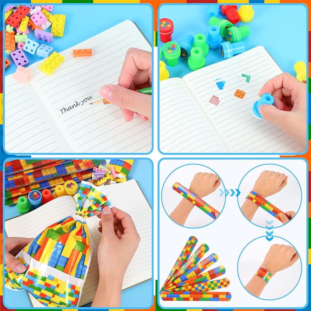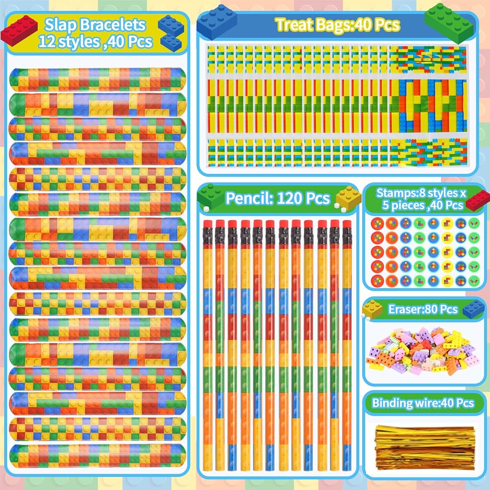 Enough quantity: the building block stationery set includes 120 building block pencils, 80 building block shaped erasers, 40 slap bracelets, 40 gift bags with handle and 40 building block stamps, a total of 320 pieces, sufficient quantities for your building block party decorations needs