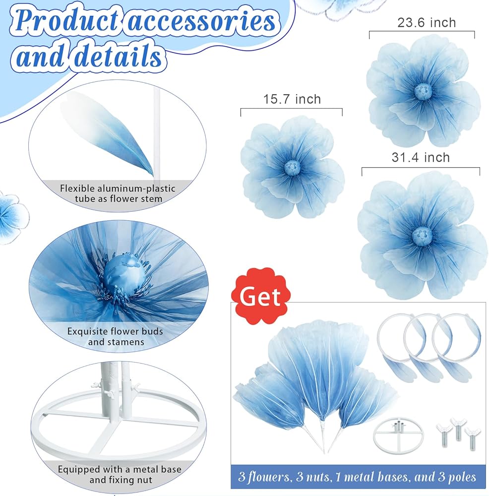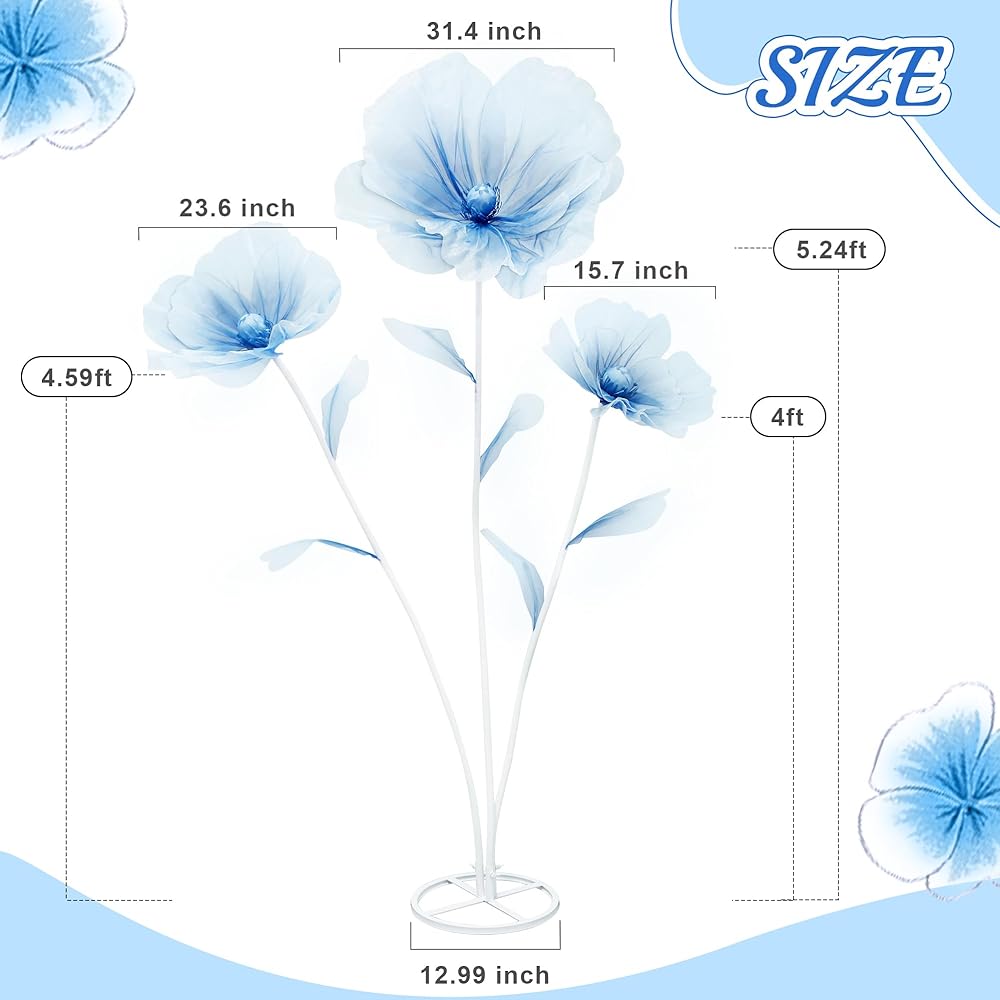 Giant Flower Size: You will receive 3pcs artificial flowers, equipped with a metal base and fixing nuts. The maximum vertical height is about 5.9 ft, and the flower head diameter is 31.4/23.6/15.7 inches