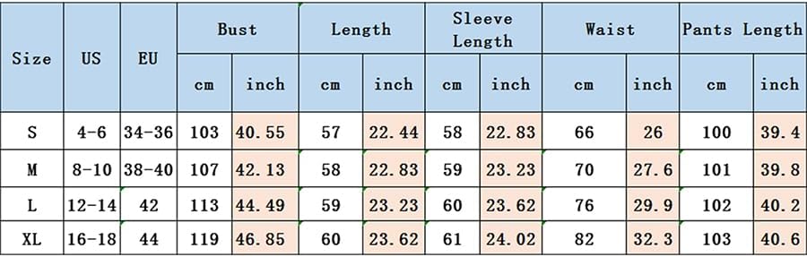 XL Tops Length: 23.62 Bust: 46.85 Sleeve: 24.02 Pants Length: 40.16 Waist: 31.5 Hip: 46.46