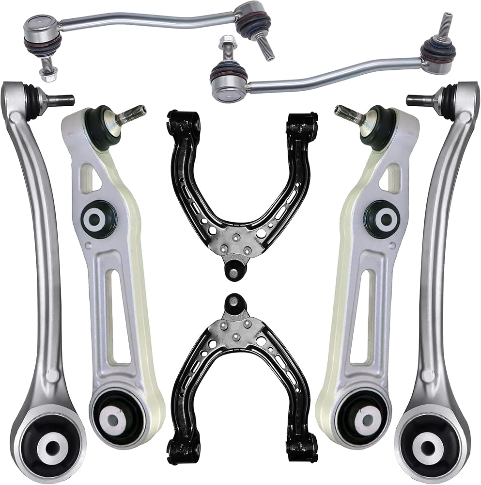 محتويات مجموعة ذراع التحكم الأمامي: 2X ذراع تحكم سفلي أمامي مع مفصل كروي للأمام، 2X ذراع تحكم سفلي أمامي مع وصلة كروية للخلف، 2X وصلة شريط التأرجح الأمامي، 2X طرف قضيب ربط خارجي أمامي، 2X طرف قضيب ربط داخلي أمامي