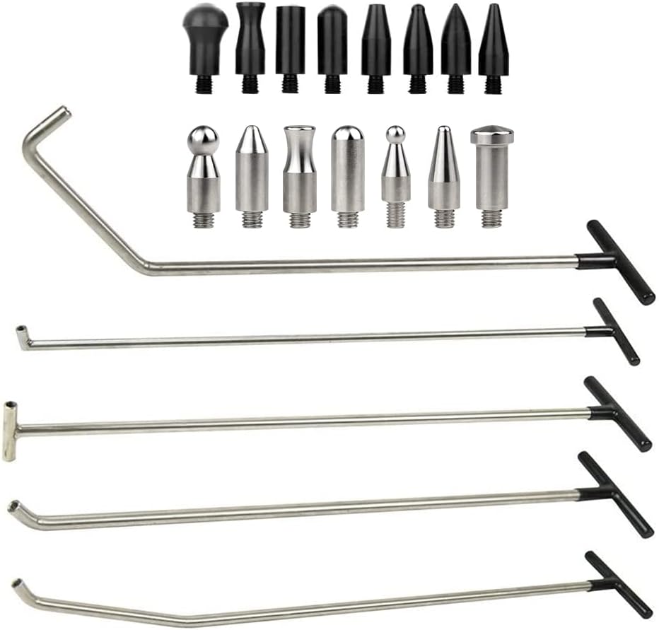 قضبان إصلاح الخدوش بدون طلاء برؤوس المخرز، يمكنك وفقًا لحجم الخدوش أو الانحناءات الفعلية، ثم تحديد تركيب رأس المخرز المناسب. المخرز مصنوع من المطاط والفولاذ المقاوم للصدأ، ولن يضر الطلاء الأصلي على سطح الجسم
