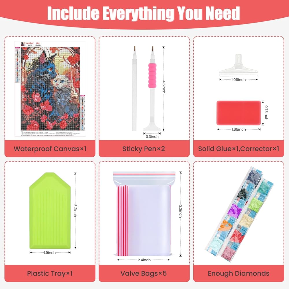 Contain All Tools - Diamond gem art painting kits contain all tools:1 high definition canvas,1 diamond tray,1 big wax,2 diamond pens,1 replaceable correction pen,5 ziplock bags and enought round diamonds, so you don't need to purchase any additional tools.