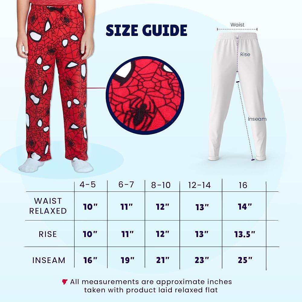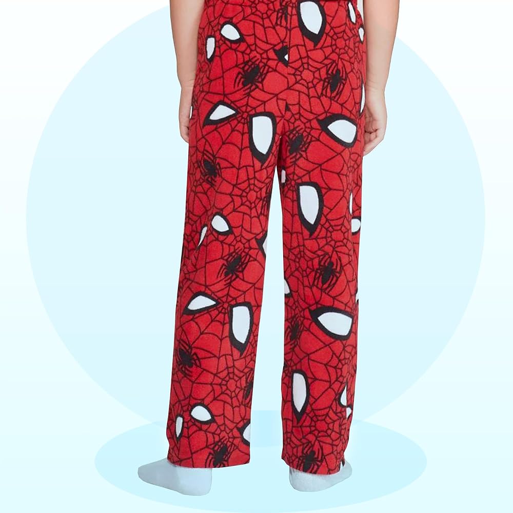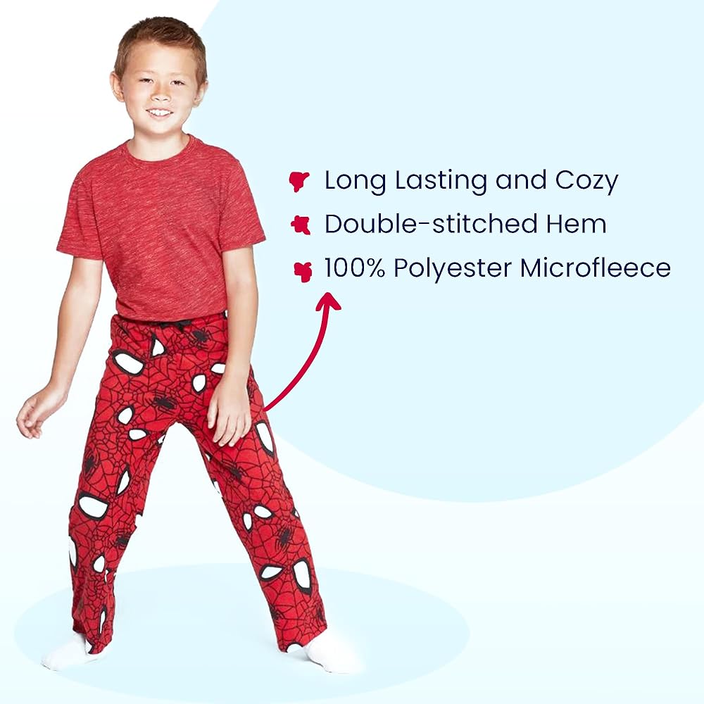 Save the day with these Marvel Spider-Man boy's fleece pajama pants! Perfect for any Spidey fan, these red pajama bottoms feature an all-around print of his favorite Marvel superhero. These soft lounge pants have an elastic waist, faux drawstring, and double stitched hems. They're also made of 100% polyester fabric that's flame resistant for safety. Available in kid's sizes 4-5, 6-7, 8-10, 12-14 and 16.