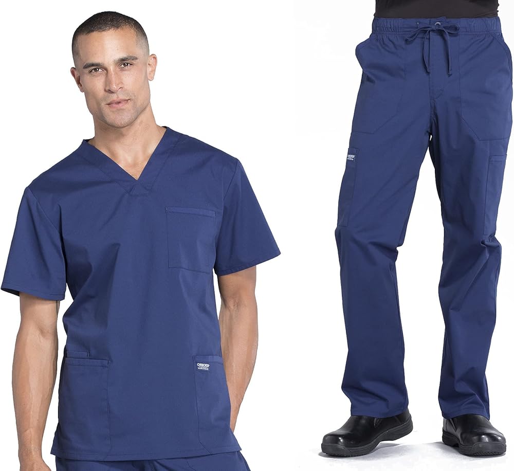 SPECIAL BUNDLE INCLUDES 2 ITEMS: Workwear Professionals Men Medical Uniform Scrub Bundle Set V-Neck Top WW695 & Tapered Leg Fly Front Cargo Pant WW190S