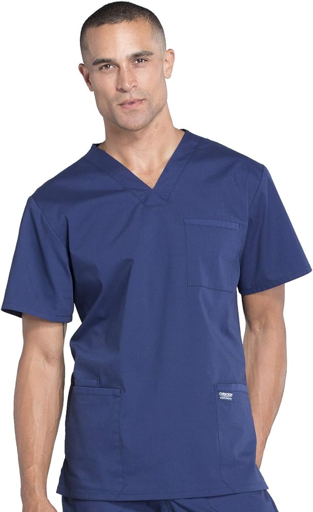Workwear Professionals SCRUB TOP PRODUCT DESCRIPTION: A Men's Traditional fit V-neck top features a chest pocket, two patch pockets, a cell phone pocket, a hidden instrument loop, back yoke and side vents. Center back length: 29". SCRUB BOTTOM PRODUCT DESCRIPTION: A Men's Traditional fit tapered leg pant with a functional drawstring and elastic waistband features a zip fly with button closure, front patch pockets, two cargo pockets and a back pocket. Inseam: 29 1/2”