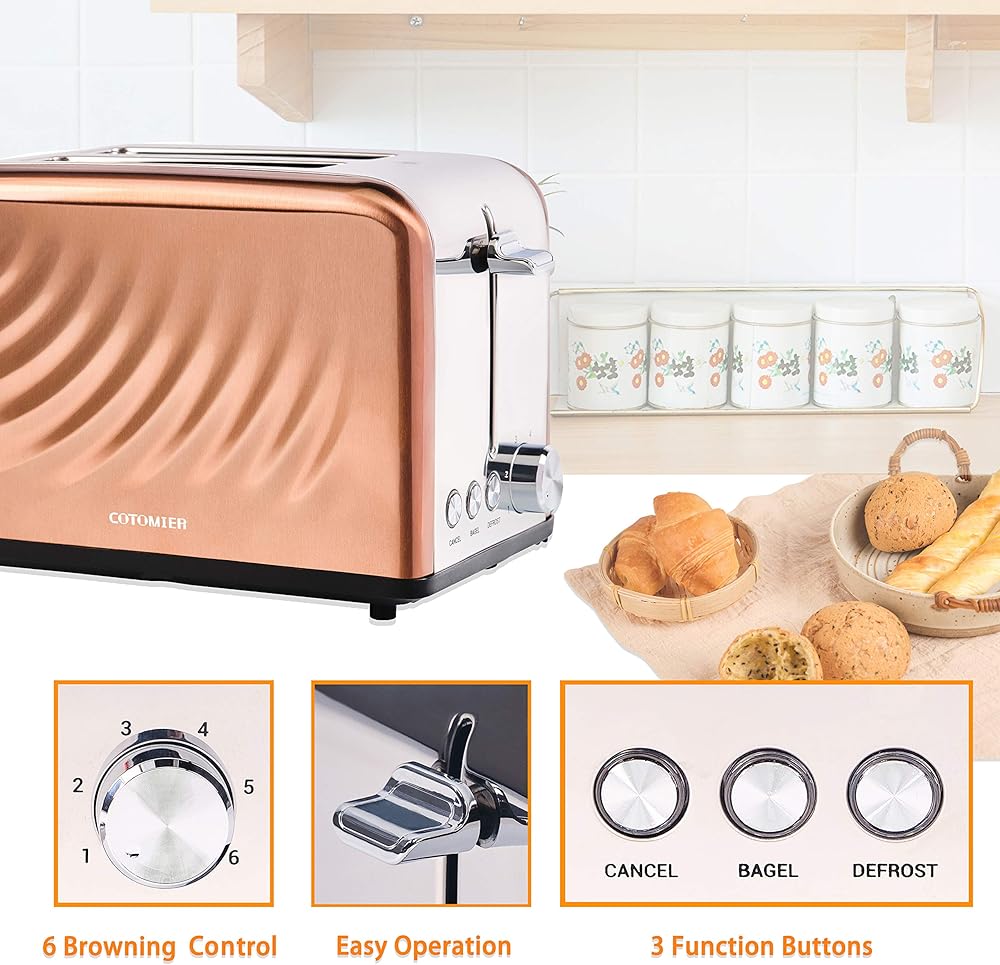 [Make Perfect Breakfast in a Few Minutes] 6 Bread Shade Settings. Automatic evenly fast toasting. The Cotomier 2 slice toaster quickly and consistently browns your bread perfectly for both sides, top to bottom.