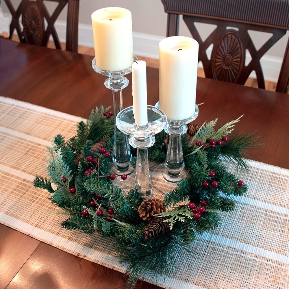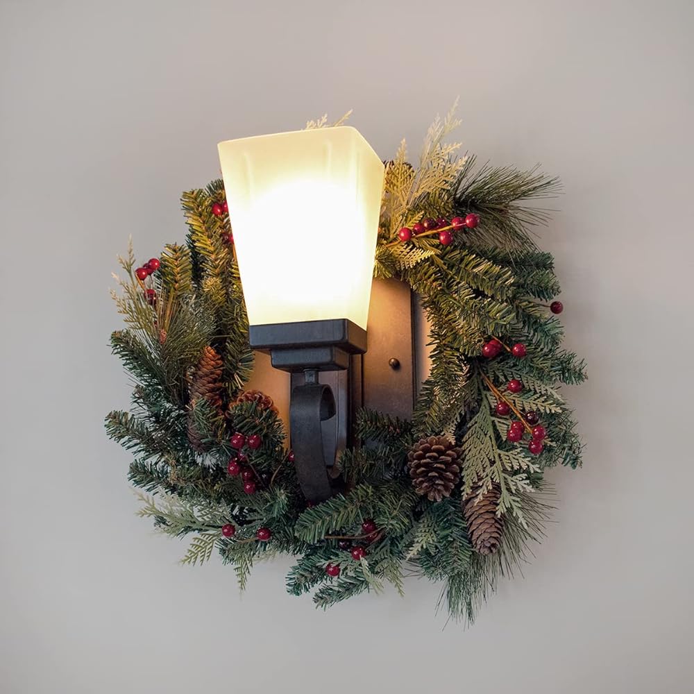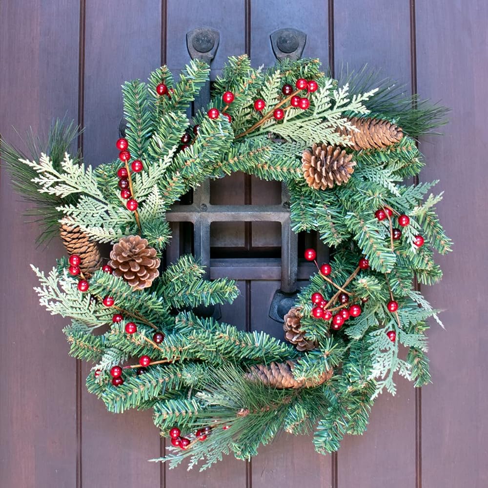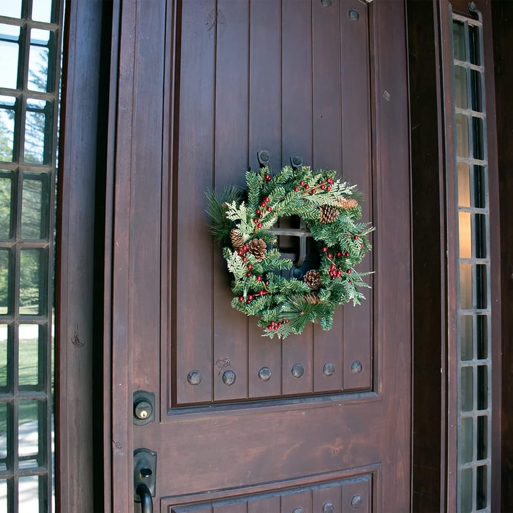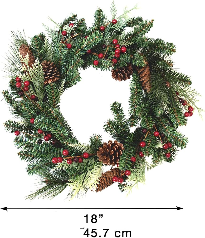Welcome the holidays with this 18" decorative Christmas Wreath. This festive decoration is decked with realistic greenery, pinecones, and red berry clusters. Bring holiday cheer to a door, entryway, mantle, and anywhere around your home. This eye-catching green wreath can be used year after year with its timeless holiday charm.
