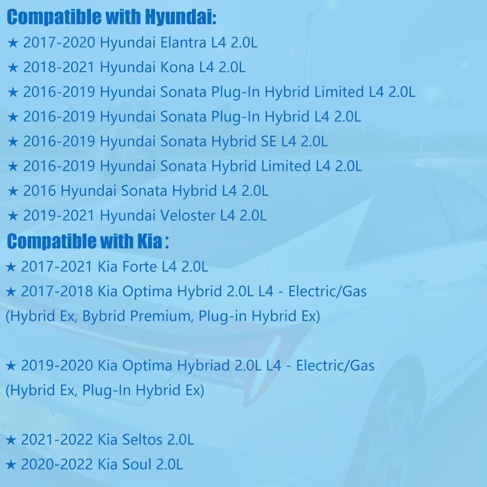 • متوافق مع Hyundai Elantra 2017 2018 2019 2020 2.0L، Kona 2018 2019 2020 2021 2.0L، Sonata Hybrid 2016 2017 2018 2019 2.0L، متوافق مع Kia Forte 2017 2018 2019 2020 2021 2.0 لتر، أوبتيما هايبرد 2017 2018 2019 2020 2.0 لتر، سيلتوس 2021 2022 2.0 لتر، سول 2020 2021 2022 2.0 لتر