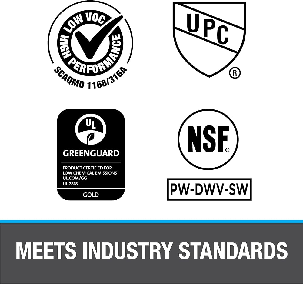 COMPLIANCE: Certified to UL Greenguard Gold, complies with NSF/ANSI 61 health effects requirements, and meets SCAQMD 1168/316A or BAAQMD method 40 as well as ASTM D2564