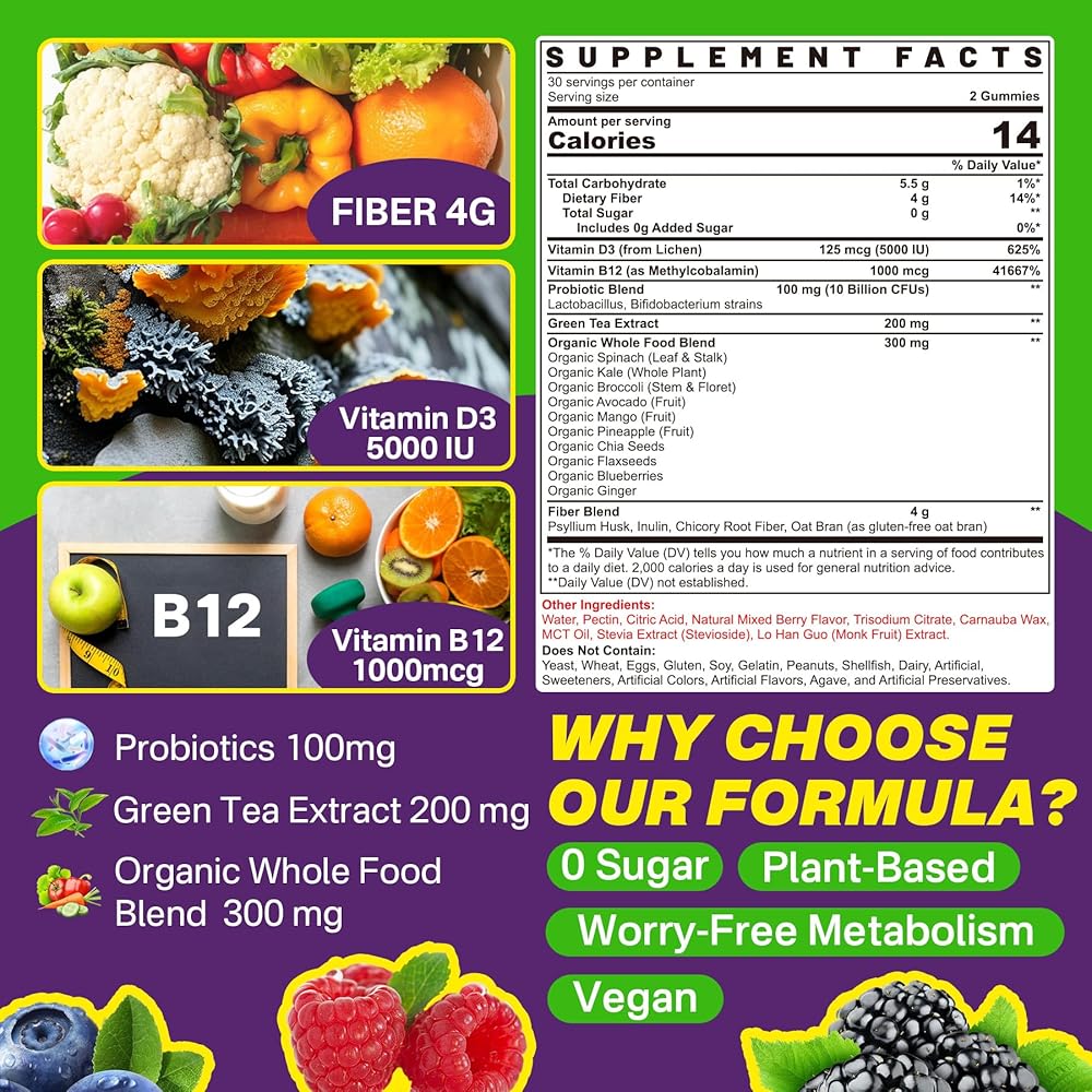 • [تعزيز الأداء، لا تقلق من تناول السعرات الحرارية]: ادعم إشباعك وطاقتك من خلال علكات فيتامين الألياف التي تحتوي على 1000 ميكروجرام من فيتامين ب12 و5000 وحدة دولية من فيتامين د3. تساعد هذه العلكات منخفضة السعرات الحرارية، المصممة لتعزيز الشعور بالشبع، على تقليل تناول السعرات الحرارية مع الحفاظ على نشاطك. قد تجعلك الألياف اليومية المضافة ومزيج الطعام العضوي الكامل تشعر بالشبع، ويسهل عليك توديع الأطعمة ذات السعرات الحرارية العالية. استمتع الآن بفوائد النظام الغذائي المتوازن مع تعزيز الطاقة وتقليل الرغبة الشديدة!