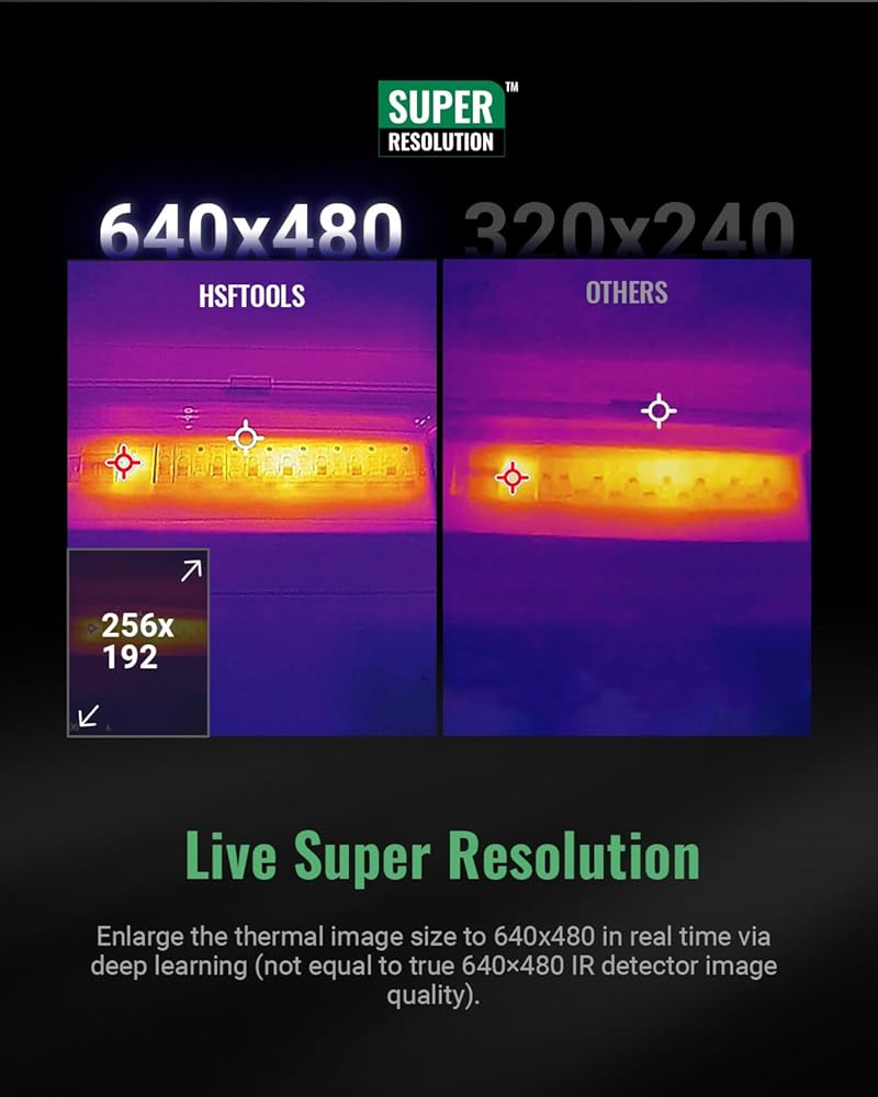• 【دقة فائقة، تجربة تصوير حراري نهائية】يتميز جهاز التصوير الحراري F2W بخوارزمية الدقة الفائقة HSFTOOLS، ويأخذ تحسين الصورة الحرارية في الوقت الفعلي حيث تقفز الدقة من دقة الكاشف 256 × 192 إلى دقة تصوير مذهلة تبلغ 640 × 480. توفير عرض سلس وحيوي على شاشة LCD مقاس 3.2 بوصة، بفضل معدل الإطارات العالي الذي يبلغ 25 هرتز. مع حساسية حرارية استثنائية أقل من 40 ميلي كلفن، يلتقط جهاز التصوير الحراري هذا تفاصيل عالية الوضوح لم يسبق لها مثيل.