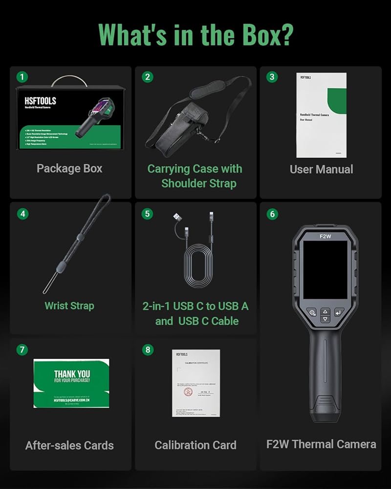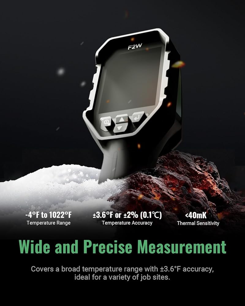 • 【قياس دقيق لدرجة الحرارة】تعتمد كاميرا الأشعة تحت الحمراء F2W كاشف VOx متطور، مما يمكّنها من اكتشاف فروق درجة الحرارة التي تصل إلى 0.04 درجة مئوية والتأكد من أن تباين قراءات درجة الحرارة في حدود الحد الأقصى (±3.6 درجة فهرنهايت، ±2%). بالإضافة إلى ذلك، يسمح جهاز التصوير الحراري للمستخدمين بتغيير إعدادات الانبعاث بناءً على مواد محددة وضبط المسافة إلى الأشياء، مما يضمن قياسات أكثر دقة لدرجة الحرارة لمجموعة متنوعة من المواد، بما في ذلك الخشب والطوب والمزيد.