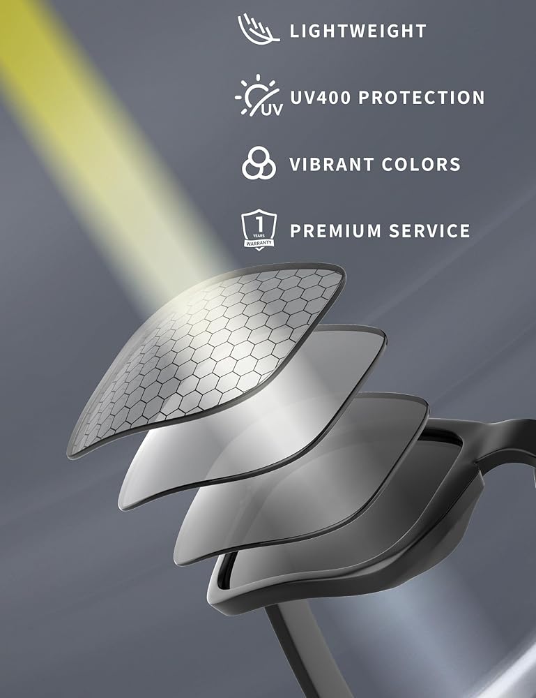 Advanced Polarization - Our lenses use advanced polarization technology to eliminate glare and enhance color contrast. Help you avoid distractions and temporary blindness caused by glare, and also help you see brighter scenes and more vibrant colors more clearly. Protect your eyes from long-term damage by blocking 99% of UV rays.