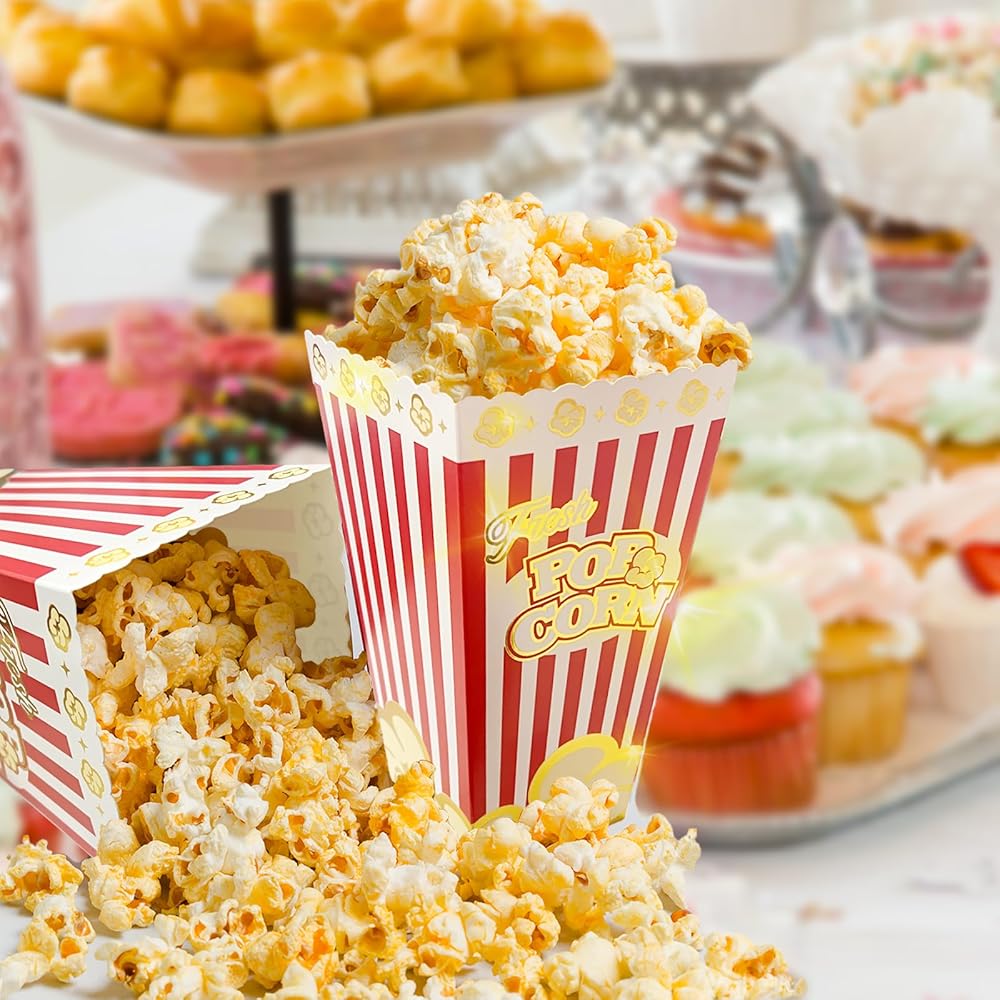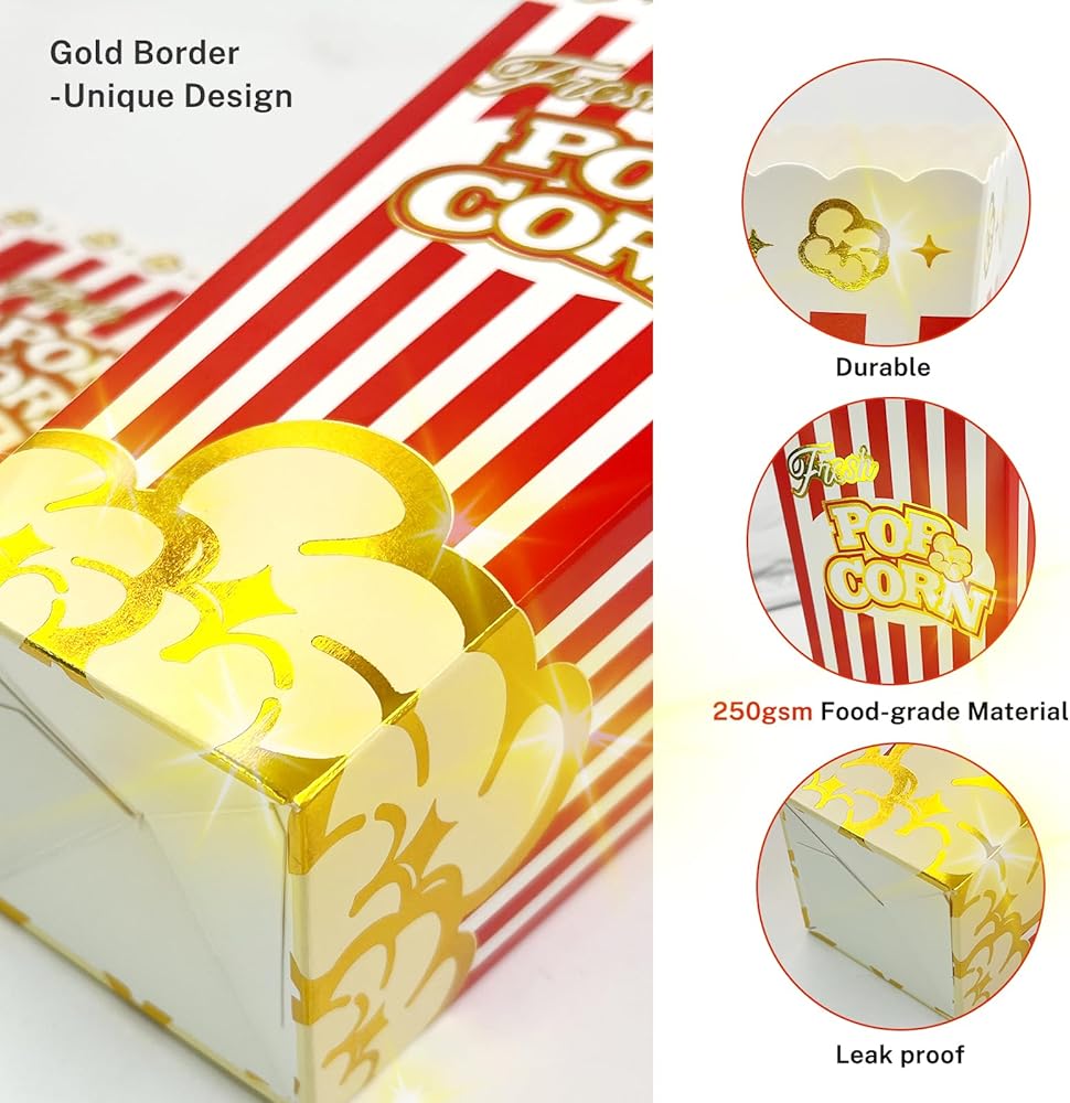 Unique Popcorn Boxes-Great Food Box Decoration For Movie Nights You Will Get A Special Popcorn Bucket Different From The Rest Red/White Stripes Design,Attract the attention of your guests,Create a movie theme and easy atmosphere. Gold Boeder Design,Great party decoration to refresh and attcact your guests.