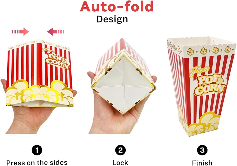 [Easy to Use And Store]You will get Foldable Popcorn Paper Containers so they can be easily stored until you're ready to use them! Due to the convenient-fold design,it's really easy to assemble,you just need to push inside the container and pop the bottom of the box out.