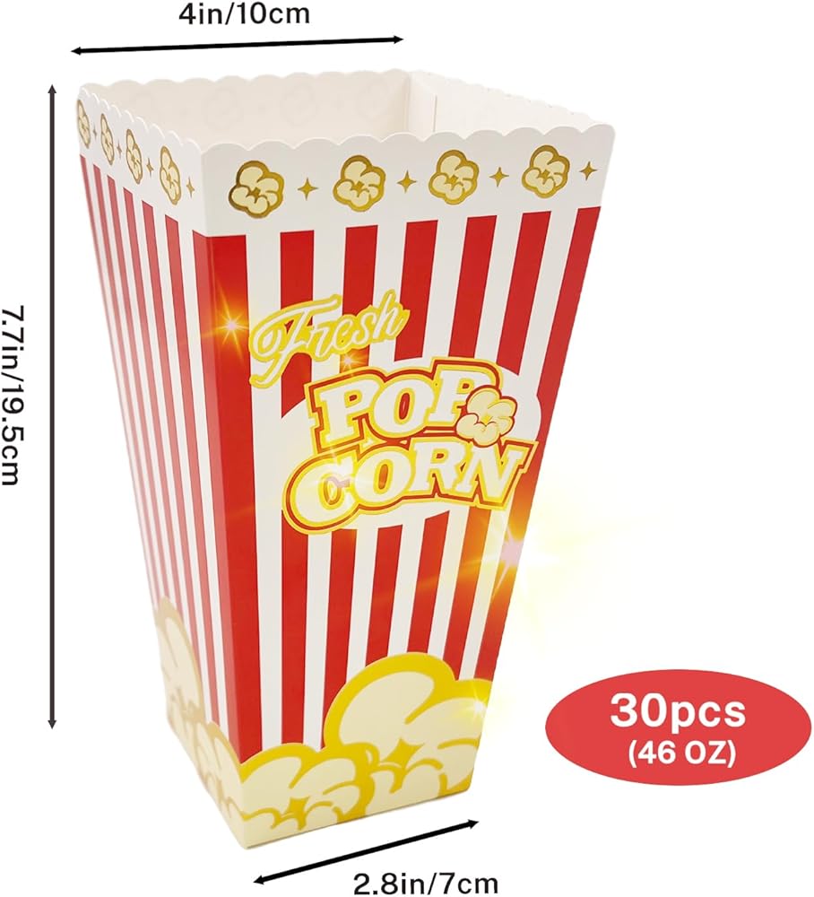 [46OZ Large Capacity&Snack Partner]You will get 30 pcs Elegant Popcorn Buckets in the package.Box size:7.7"x 4"x 2.8" 46oz, Large size box can provide an abundant supply of popcorn, and you can fill it up with a variety of Snacks,like sugars,chocolate,fruit,chicken nugget.