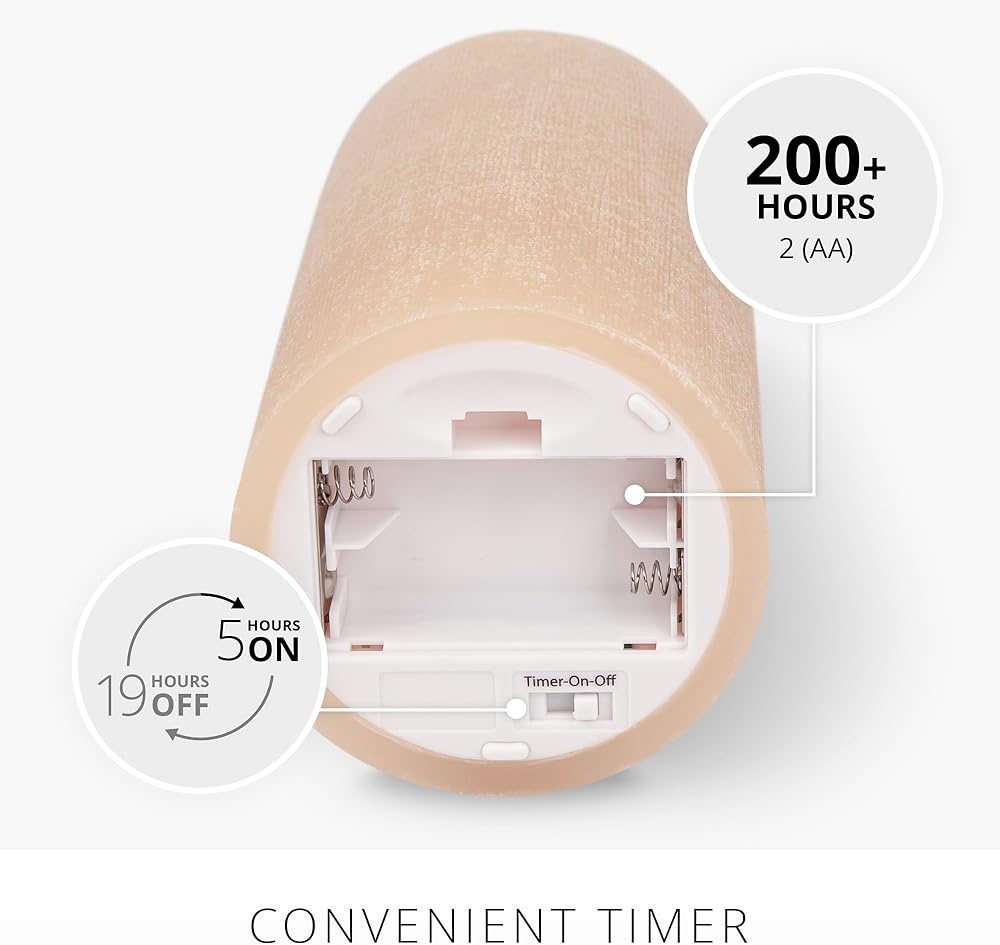 Powered by 2 AA batteries (not included), each candle offers 200 hours of safe and long-lasting illumination. Set the timer for 5 hours of brilliance, followed by an automatic 19-hour shutdown.