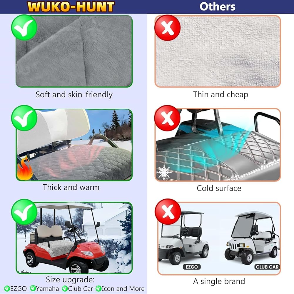 【Golf Cart Cover Protect Your Seat】This golf cart seat covers keep warm to drive outside, help you avoid that cold vinyl in cooler temperatures. Perfect for covering the cold golf seat during some winter golf.this golf cart accessories-seat blanket/cushion cover/ seat towel is perfect for cover up the ugly seat in the original seat, No need to spend more to change the seat. Weather Resistant: Constructed with weather-resistant materials to withstand outdoor elements.