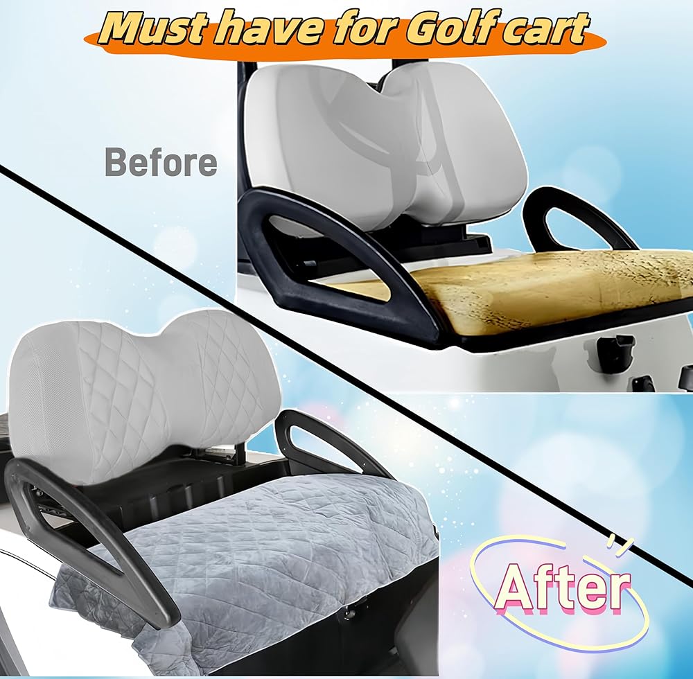 【Golf Cart Seat Cover Duralbe & Comfortable Material】The surface of Our Golf Cart Seat Cover is plush and the bottom is anti-slip particles.it can protect the golf cart seats from water, rain, snow, perfect for all weather conditions. soft fabric on one side and oxford cloth on the other. Premium Quality: Crafted from durable, high-grade materials for long-lasting performance and protection.