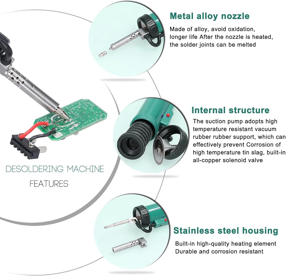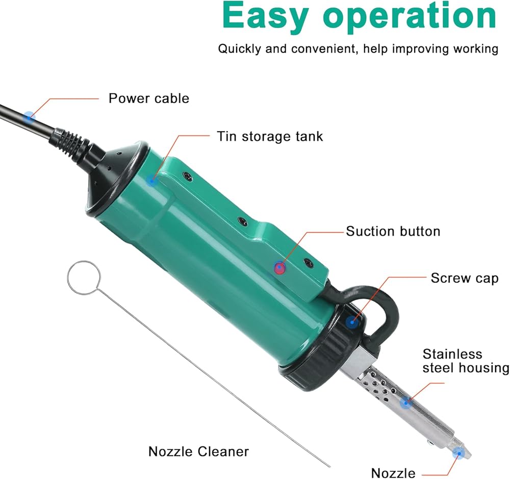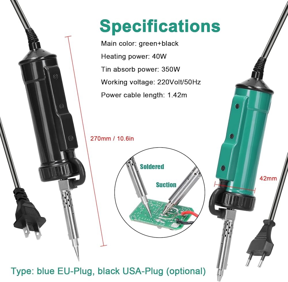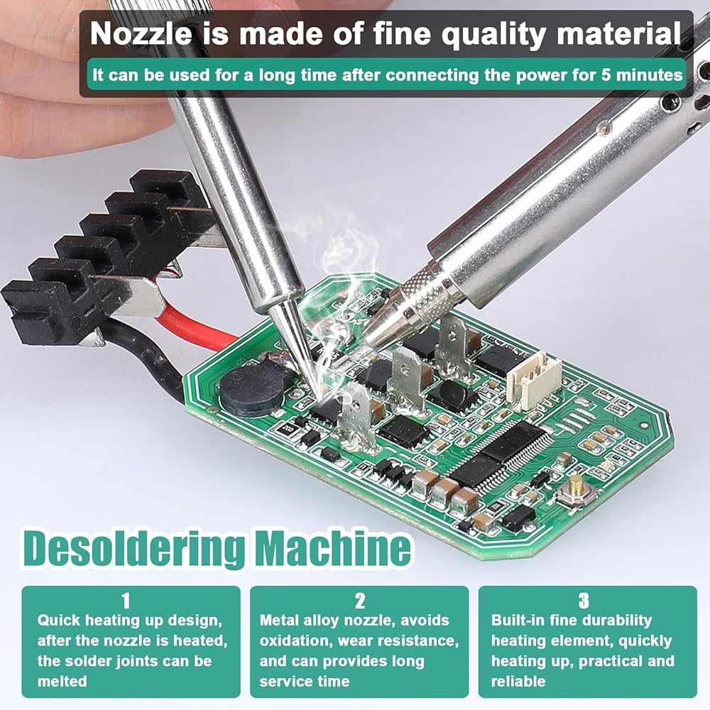 【Higher Efficiency】This is a plug-n-play desoldering iron. Plug in the power plug, allow the desoldering iron to preheat for approximately 3 minutes, and you are ready to go. 40W heating power combined with 350W desoldering power ensures you experience uninterrupted desoldering. It is an nice helper for improving work efficiency in maintenance.