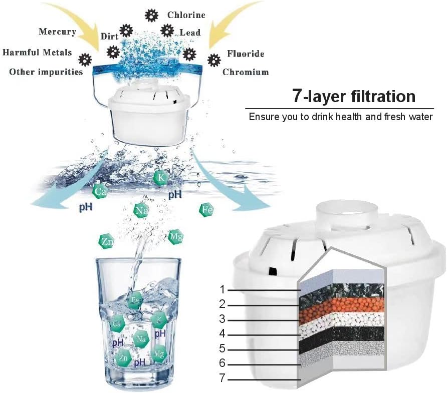 The product is made of food grade materials, BPA-Free, advanced 7 stage filtration technology, which can remove fluorine, chlorine, lead, mercury, dirt and harmful metals, it can also remove odors, while adding beneficial minerals and negative ions to balance pH between 8.0 and 10.0, it would provide safe and healthy drinking water for your family.