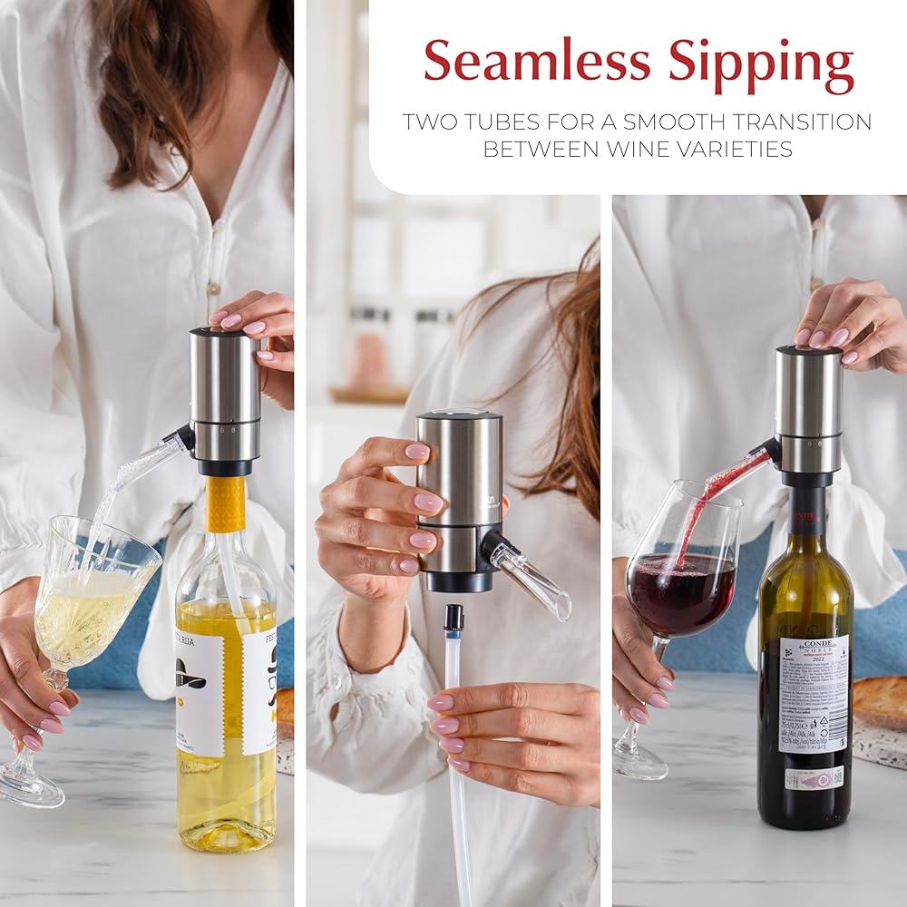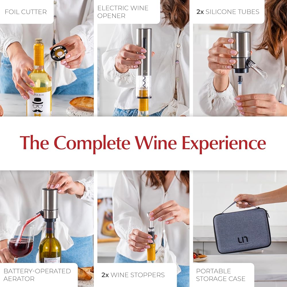 تجربة النبيذ الكاملة: مجموعة النبيذ لدينا تحتوي على جميع ملحقات النبيذ التي تحتاجها للصب المثالي؛ تشتمل على مفتاح كهربائي موفر للوقت، ومهوية نبيذ مؤكسجة، وقطاعة رقائق معدنية غير ملحومة، وسدادتين للنبيذ، وأنبوبين من السيليكون، وحقيبة تخزين أنيقة.