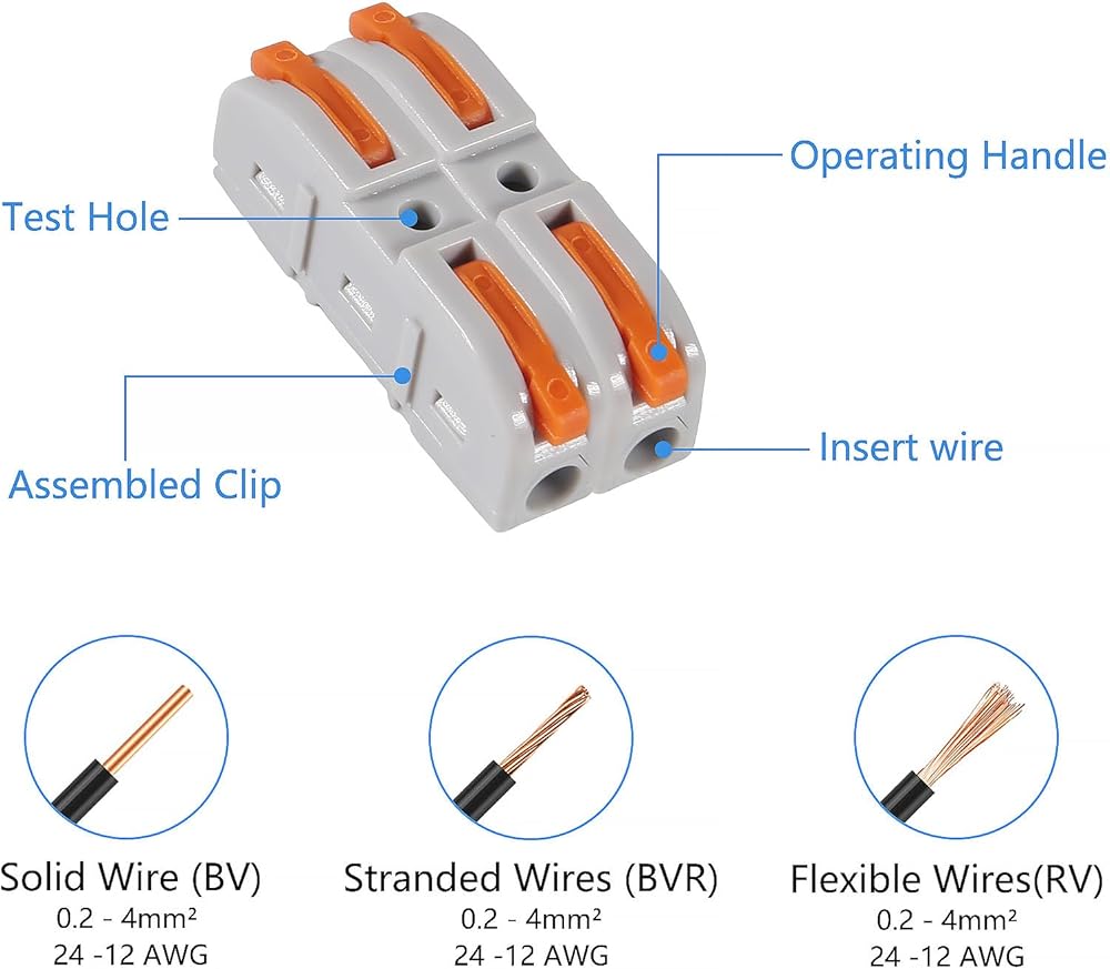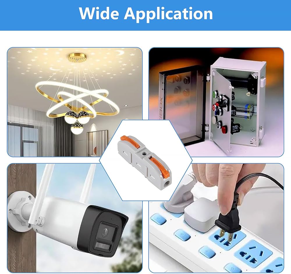 【Wide Application】Suitable for wire size 0.2~4mm²/AWG24-12. Used to connect braided and solid wires of various sizes, this connector is a versatile tool for various electrical applications, such as household wiring for ceiling fans, sockets, switches, vehicles, motorcycles, ships, loudspeakers, lamps, electrical boxes, chandeliers, light switches, fan controls, and more.