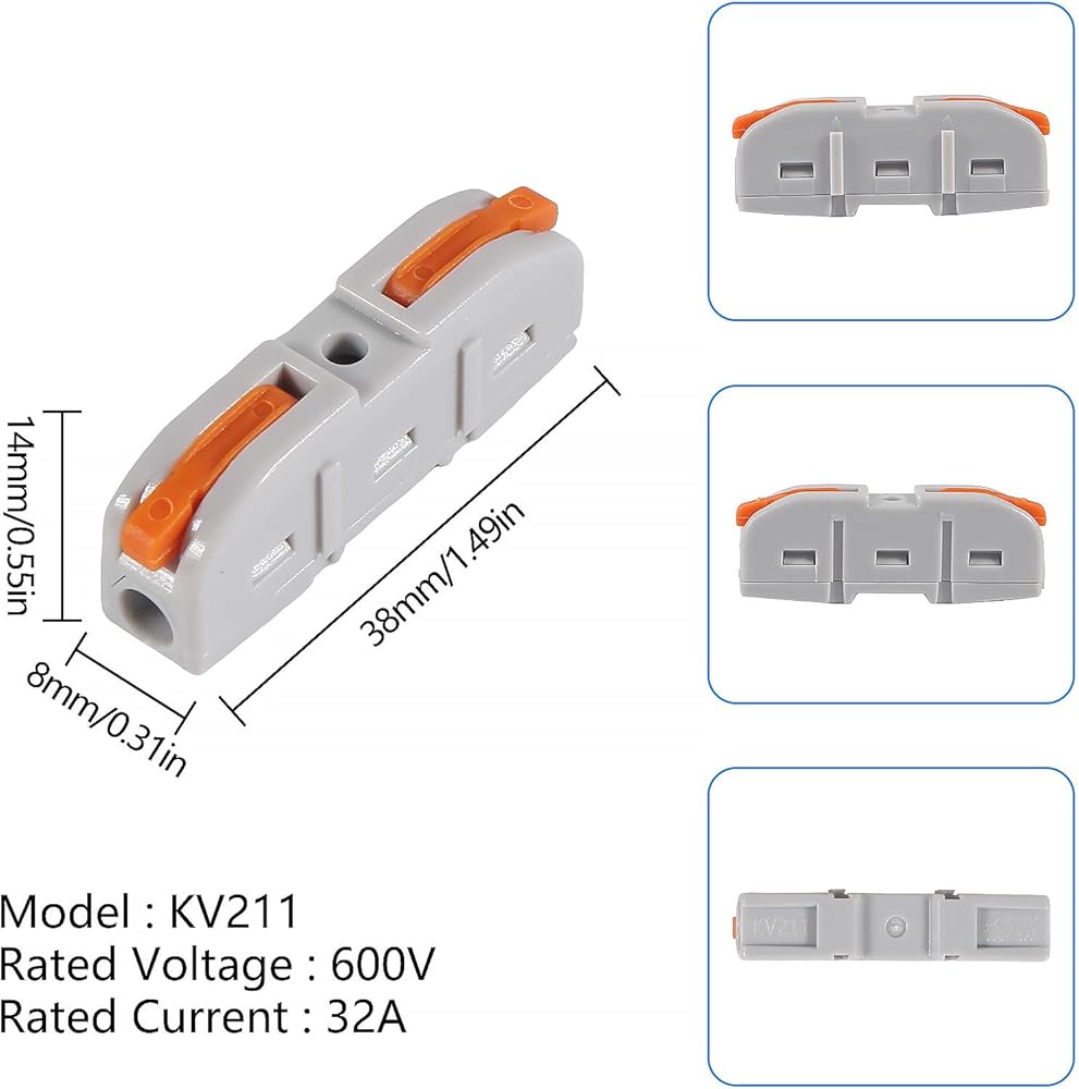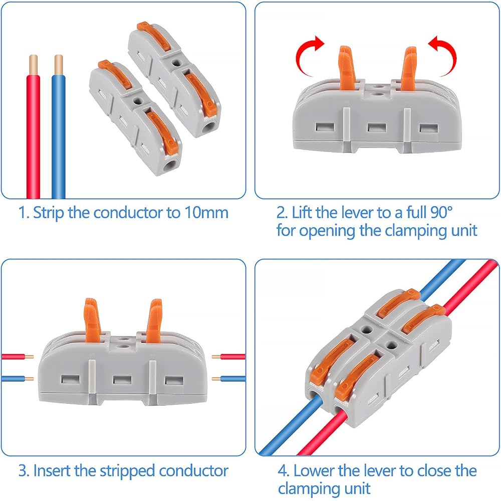 【Easy to Operate 】Push the orange handle to 90 ° and insert the wire (strip the wire housing to 0.35-0.47 inch, make sure the wire is inserted at the end. Do not open the wire housing for too long), and then place the back of the wire clamp. When you make electrical connection, you only need a little force to push the lever up.