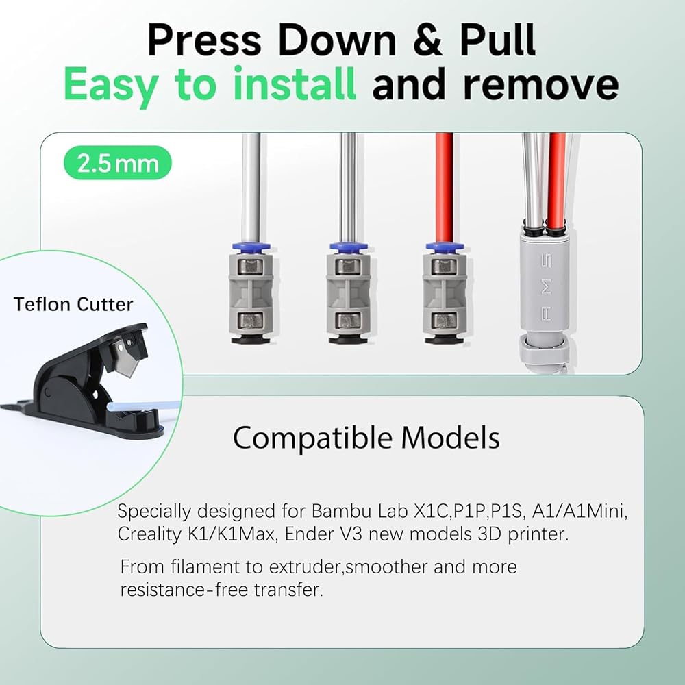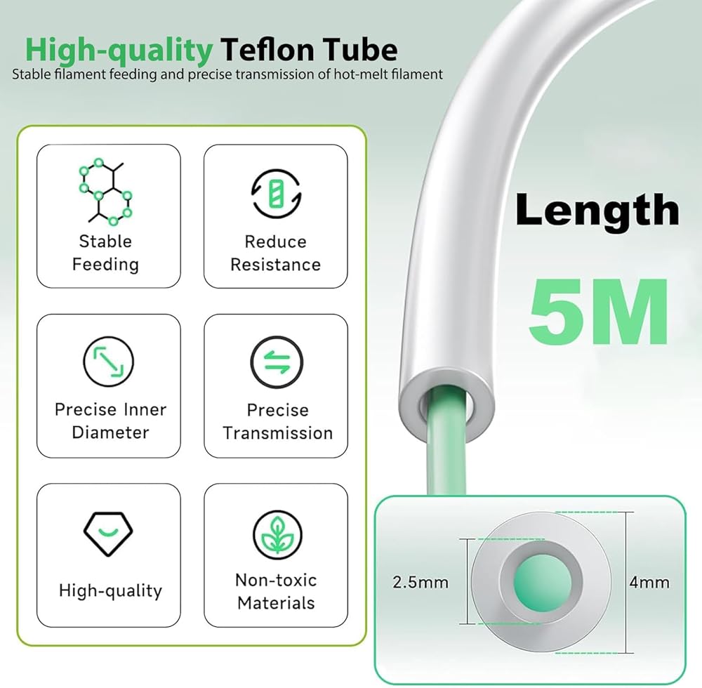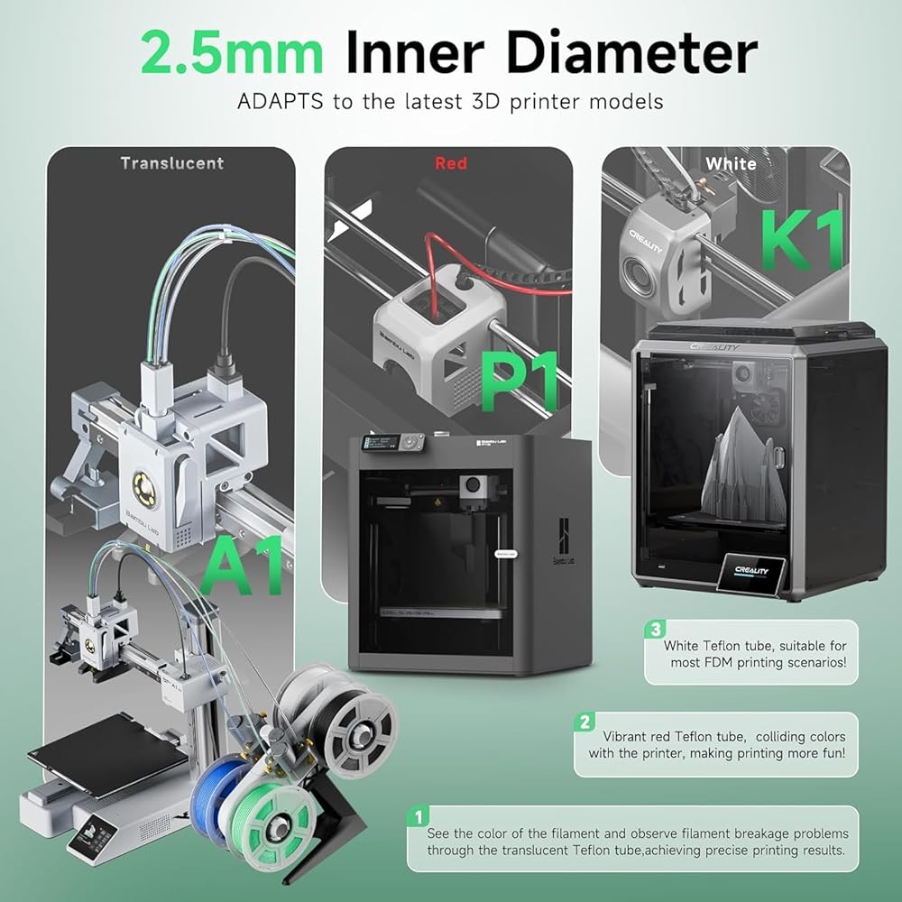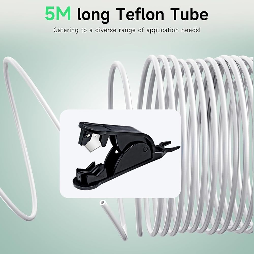 • 【Designed for Direct Drive Extruder 3D Printer】 This teflon tube is designed to be highly compatible with Direct Drive Extruder 3D printers like: For Bambu Lab A1/A1 mini/P1P/P1S/X1C and K1/K1 Max/Ender 3 V3.The package includes a 5-meter PTFE tube, 1x tube cutter, and 1 x3D printing lubricant.