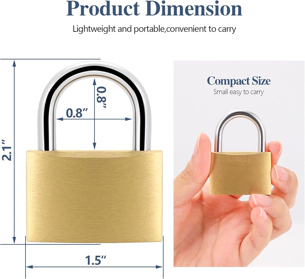• Specifications:1.57in wide lock body; 0.2 in diameter of lock beam. The lock body are smooth and rounded, without chamfering.The small size and light weight is great,our brass padlock is portable and easy to store.