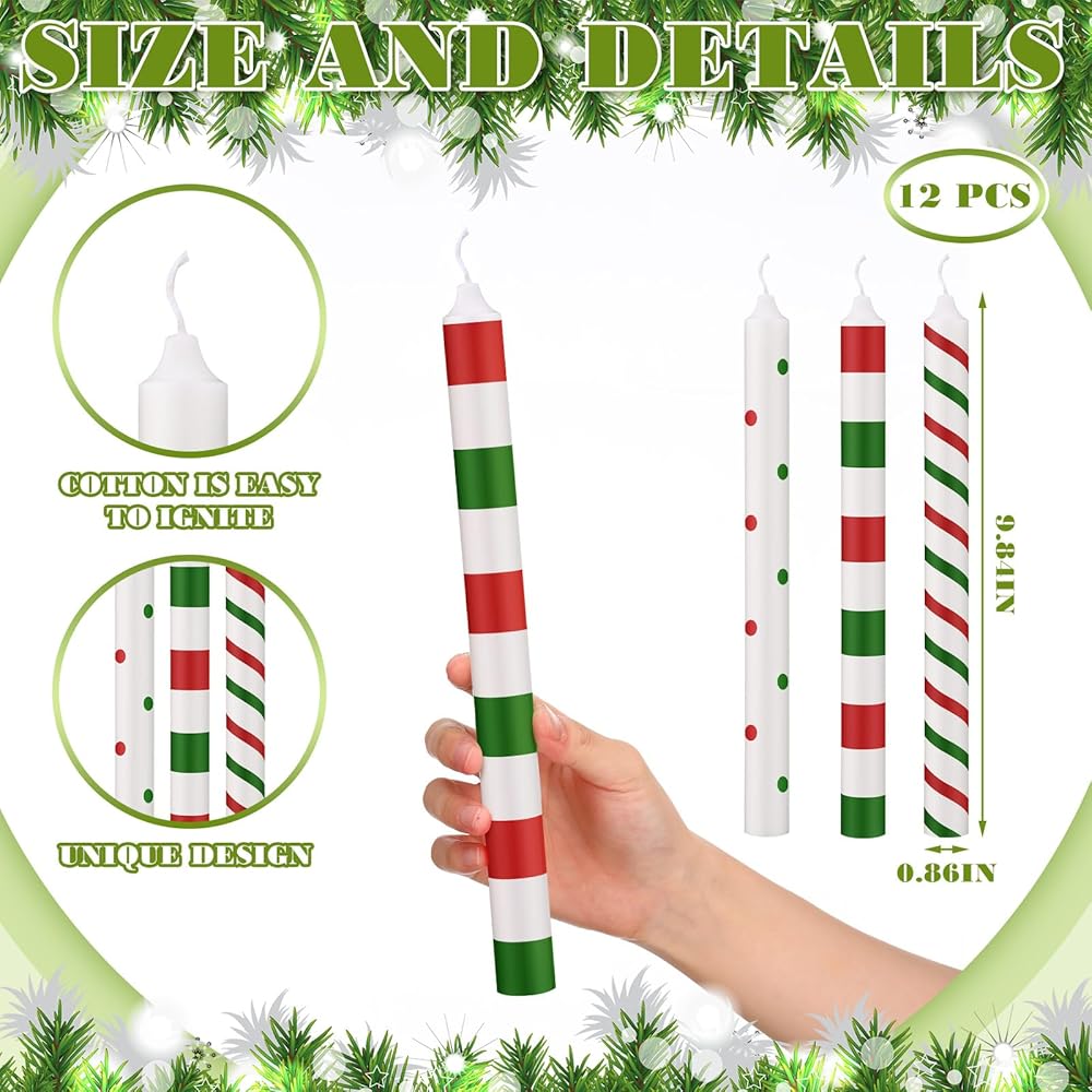 • Christmas Design: featuring a candy striped style, these Christmas wax candles well encapsulate the Christmas spirit; They not only enhance the decor but also make you feel a sense of warm; The unique design will win the hearts of you