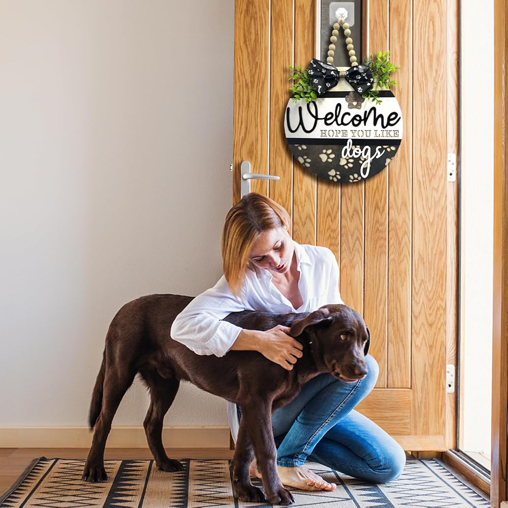 Durable Material: Made from high-quality wood, the 3D minimalist dogs welcome wreath hanging sign plaque is built to last and withstand outdoor elements. With a sturdy hanger, this warmly pet sign is suitable for indoor, outdoor, or at your front door.