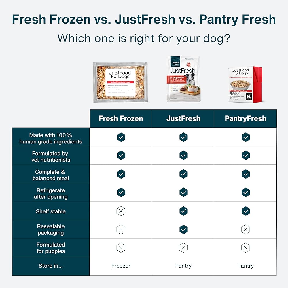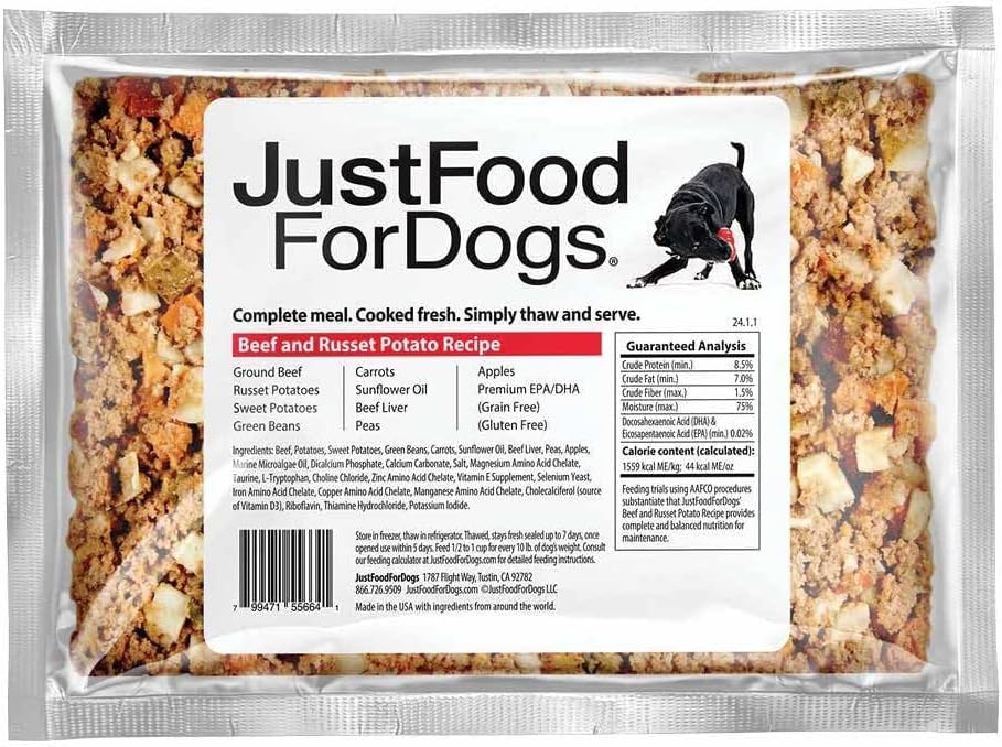 طعام للكلاب مصنوع من مواد بشرية 100%: جميع وجبات JustFoodForDogs مصنوعة من أطعمة طازجة كاملة يتم طهيها بلطف للحصول على امتصاص مثالي للعناصر الغذائية.