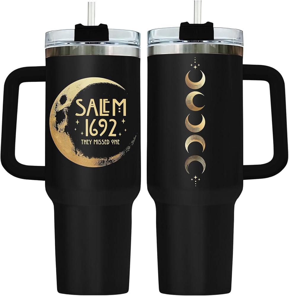 34HD Salem Witch Tumbler 40oz with Handle and Straw, Spooky Festive Moon Vacuum Insulated Cup - Laser Engraved Birthday Festive Gift for Him Her & Book Lovers