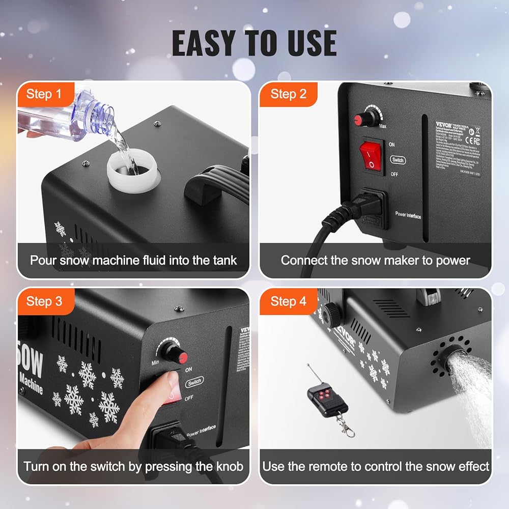 Easy to Use: The adjustable snowflake output speed makes it easy to create the ideal atmosphere for any occasion. With a wireless remote control that works within a 32.8-65.6 foot range, operating the fake snow maker is hassle-free. It includes a switch, clearly marked outlets, and an English manual for straightforward use. The visible flow meter helps monitor fluid levels and refill as needed, and the machine includes anti-dry-burn security.