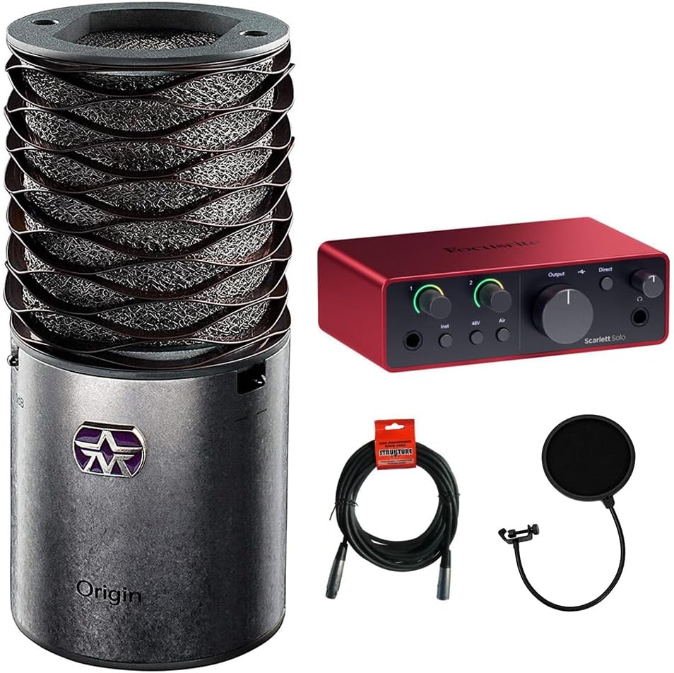 The Aston Origin is a cardioid condenser microphone that utilizes a 1” gold-evaporated capsule. It is versatile enough to use with most instruments, such as acoustic guitar and strings, and sounds great on vocals. Its hand-selected capsule is combined with transformer-less circuitry to deliver accurate sound reproduction. The mic has a mesh-knit pop filter built into the wave-form head. The weave allows sound to pass while reducing unwanted plosives. This single-piece mesh cage is formed in stainless steel, so it won't rust with use and can even be removed and washed. Bundle with the Focusrite Scarlett Solo (4th Generation) 2-in / 2-out USB-C audio interface, Pop Filter and XLR- XLR Cable