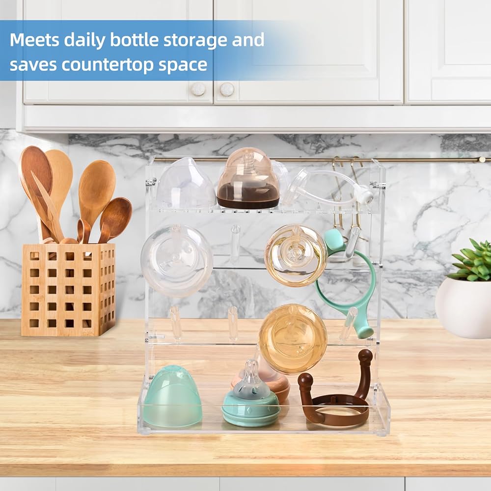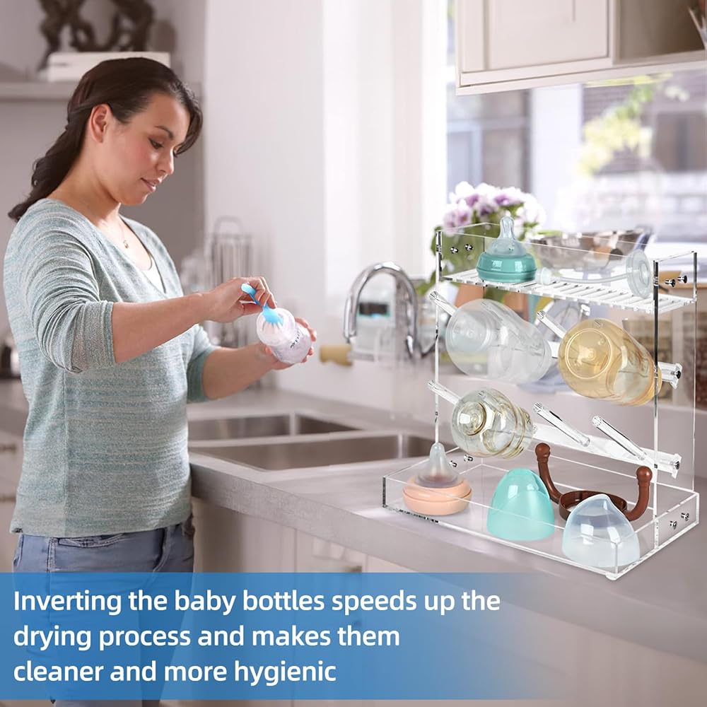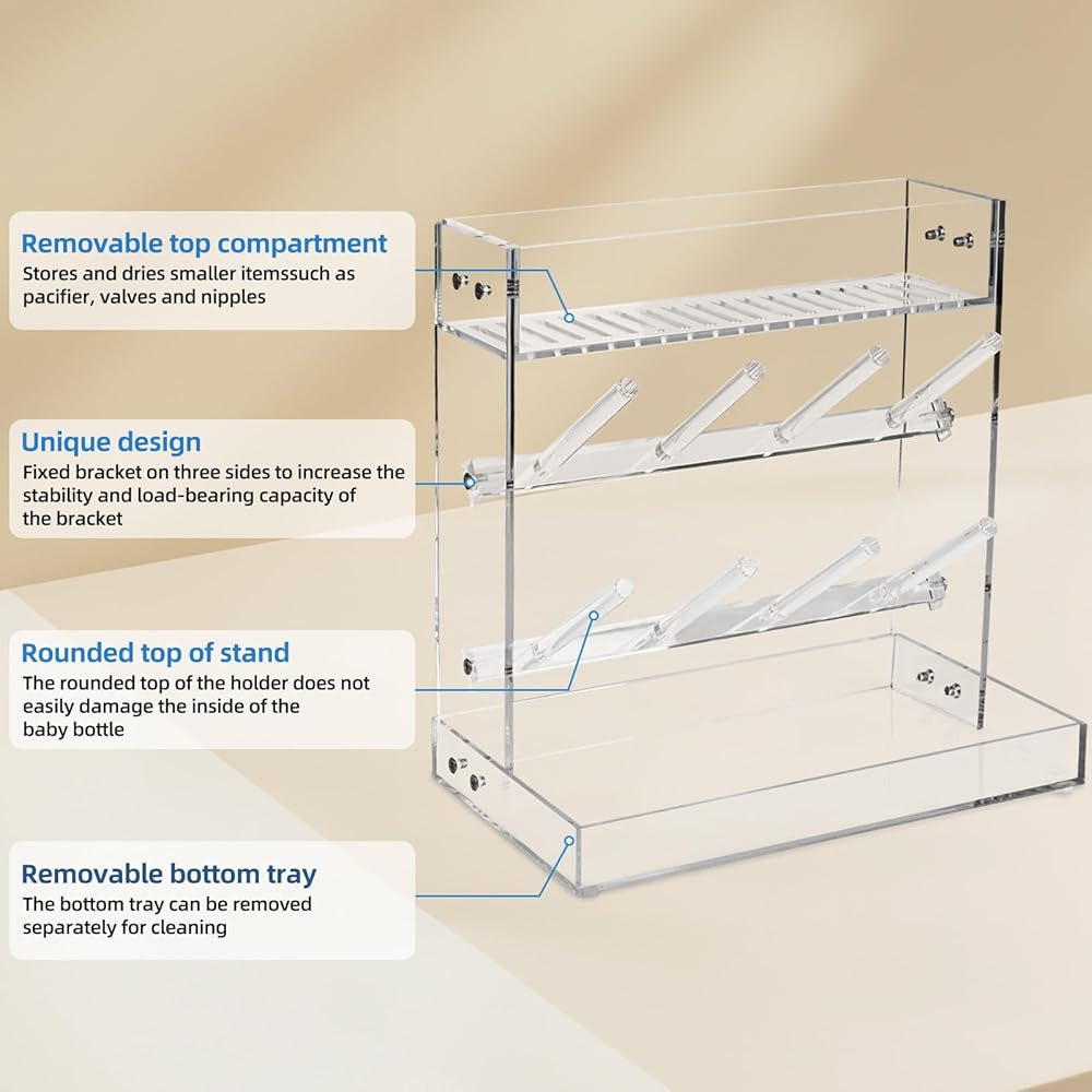 1.IDEAL FOR BABY BOTTLE DRYING: The bottle drying rack is designed for your different baby bottle kitchen organization, can holds all bottles and accessories, the top to dry nipples, covers, pump parts and more