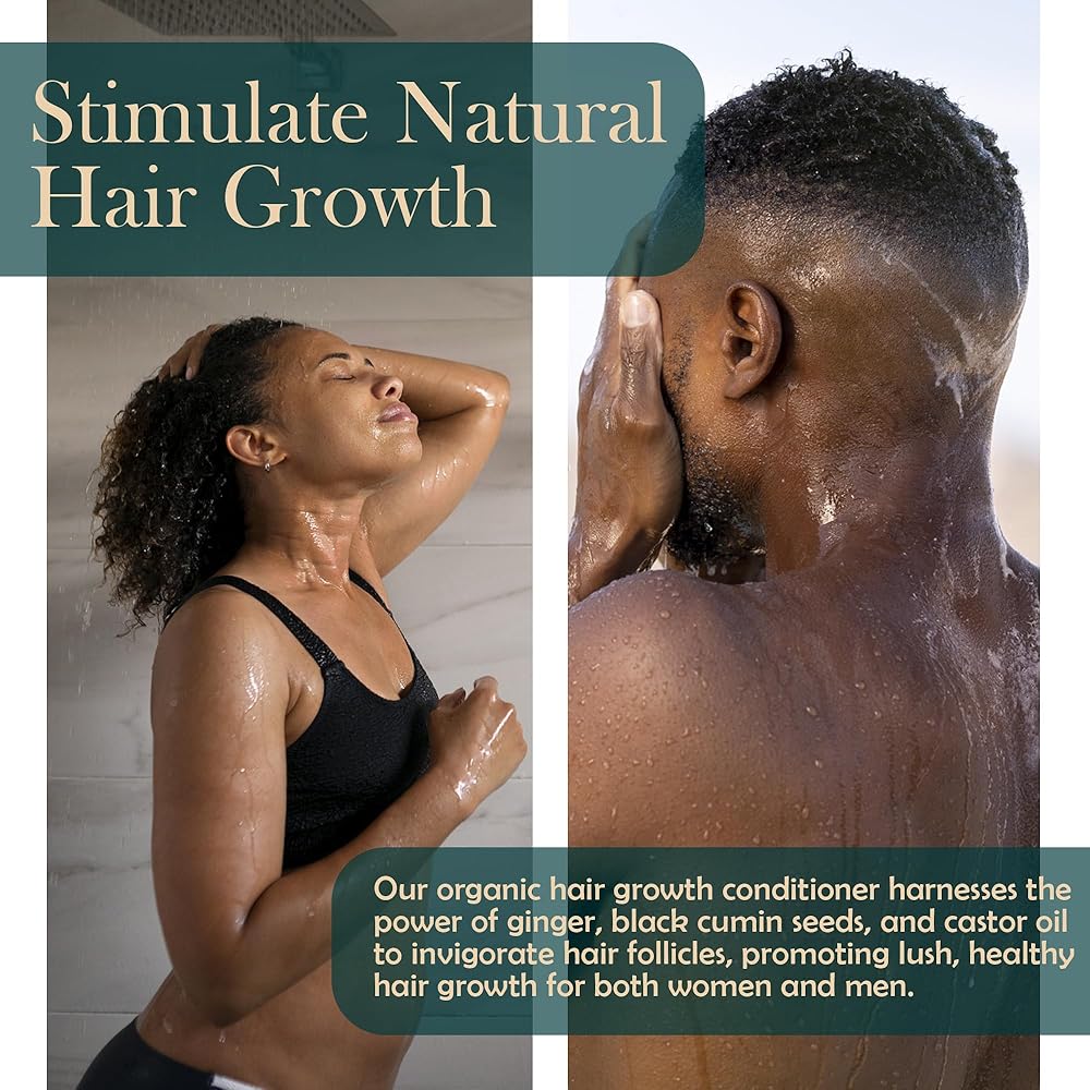 تحفيز نمو الشعر الطبيعي: يعمل بلسم نمو الشعر العضوي لدينا على تسخير قوة الزنجبيل وبذور الكمون الأسود وزيت الخروع لتنشيط بصيلات الشعر، وتعزيز نمو الشعر الخصب والصحي لكل من النساء والرجال.