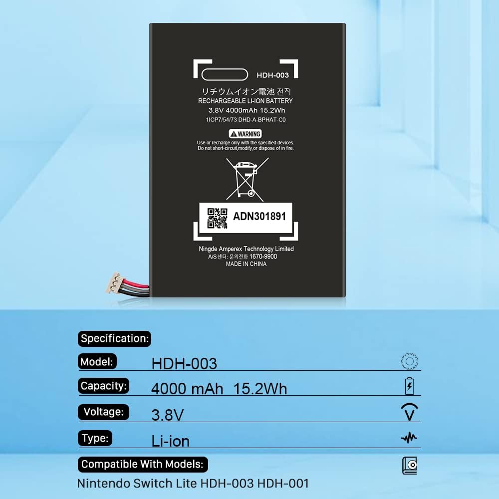 بطارية HDH-003، [4000 مللي أمبير] بطارية بديلة جديدة ذات جودة عالية لدورة 0 لوحدة التحكم Nintendo Switch Lite HDH-001، بطارية داخلية مع مجموعة أدوات التثبيت