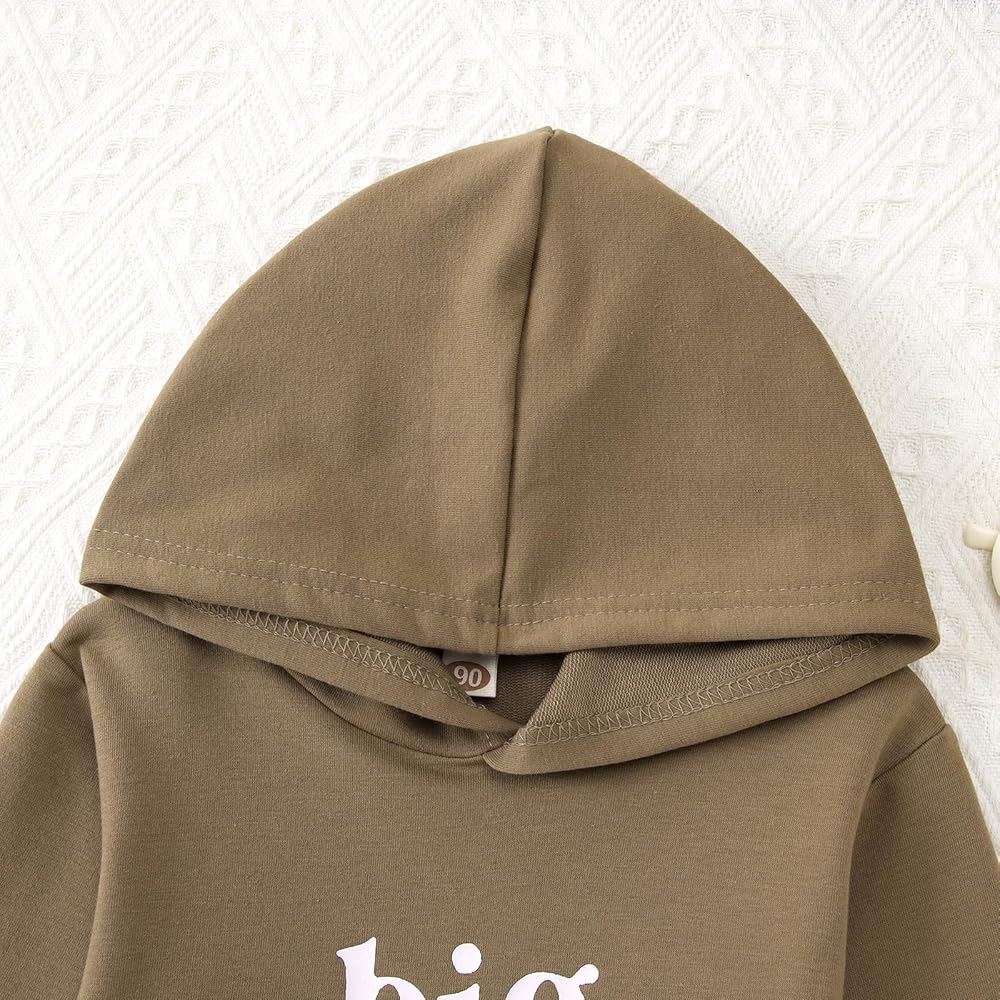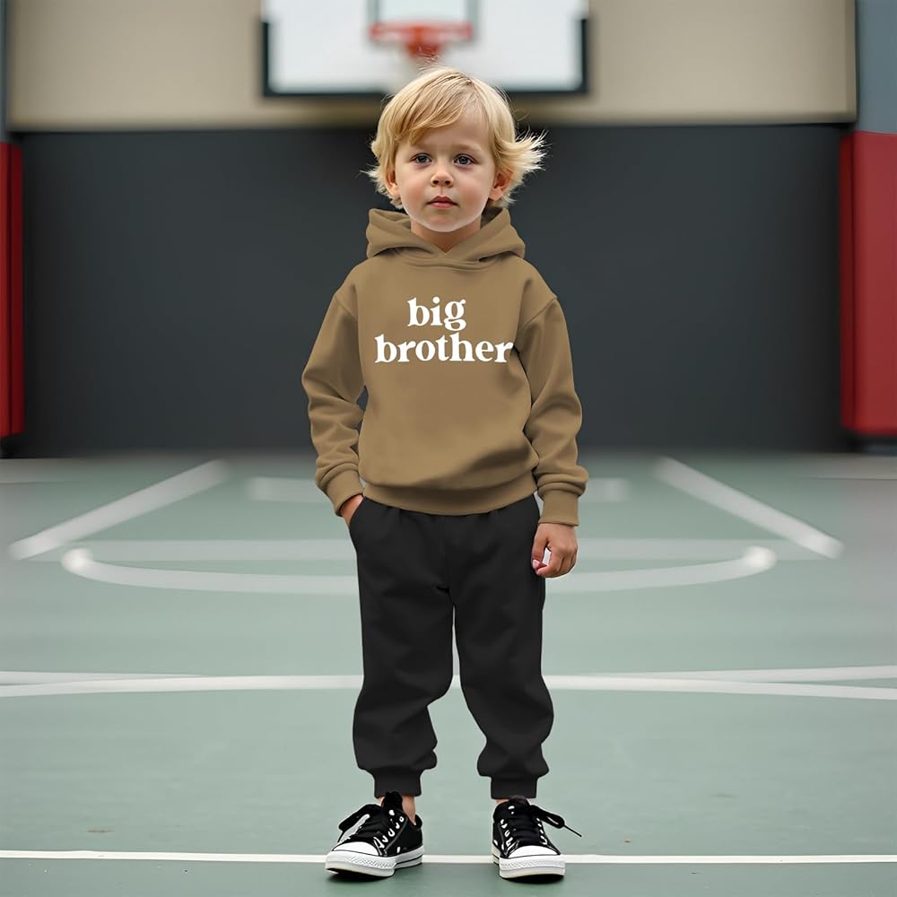 【Size】Toddler boys big brother sweatsuit set, big brother tracksuit set 2pcs, big bro fall outfits fit for 18-24 Months baby boy clothes, 2-3T boy fall clothes, 3-4T toddler boy fall winter clothes, 4-5T boy hoodie and pants set, 5-6T sweatsuits for boys. A classic, comfortable fit with long sleeve hoodie sweatshirt he'll love. Available in three colors: brown, beige and black.