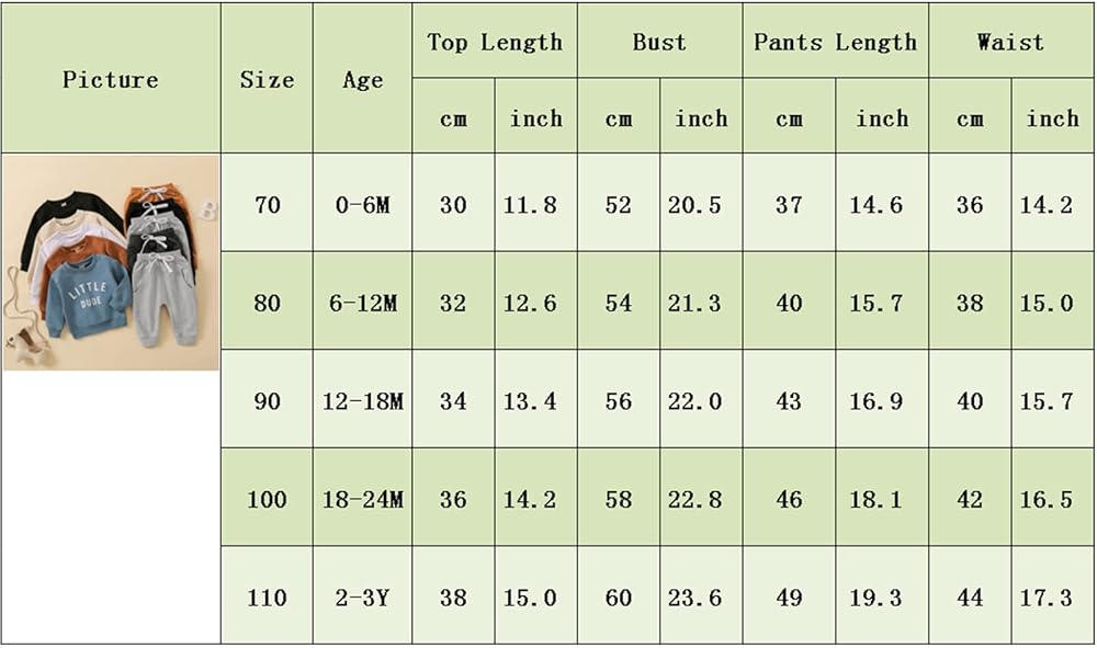 18-24M Tops Length: 14.96 Bust: 23.62 Pants Length: 18.5 Waist: 16.54 Advised Age: 18-24 Months