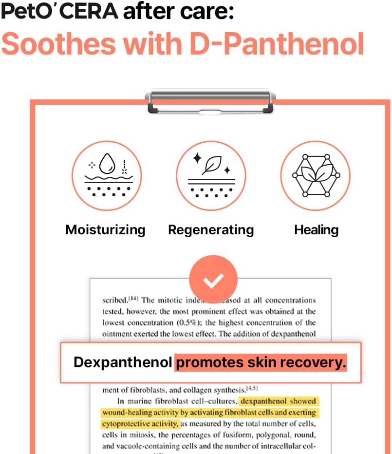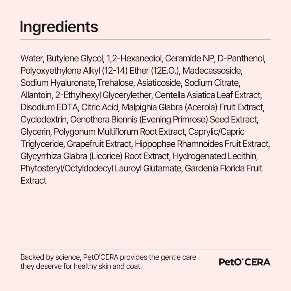 يعزز حاجز حماية البشرة الطبيعي ► تم تركيبه من السيراميد، يساعد PetO'Cera على الاحتفاظ بالرطوبة وتقوية حاجز الحماية الطبيعي للبشرة. يساعد رذاذ PetO'Cera الحساس على تجديد السيراميد الموجود في جلدك والذي يخفف من جفاف الجلد عن طريق تقليل فقدان الماء وزيادة الترطيب واستعادة حاجز الجلد.