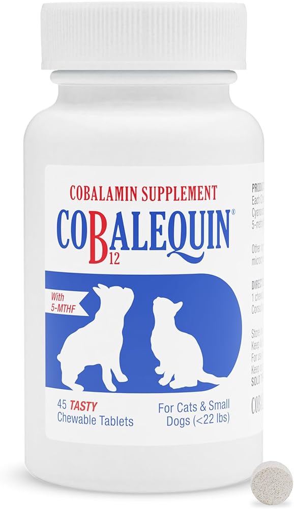 مكمل فيتامين بي 12 للقطط والكلاب الصغيرة: الكوبالامين، أو B12، أمر بالغ الأهمية لوظيفة العديد من عمليات التمثيل الغذائي داخل الجسم. قد يوصي طبيبك البيطري بالكوباليكين إذا كان حيوانك الأليف يحتاج إلى مكملات B12